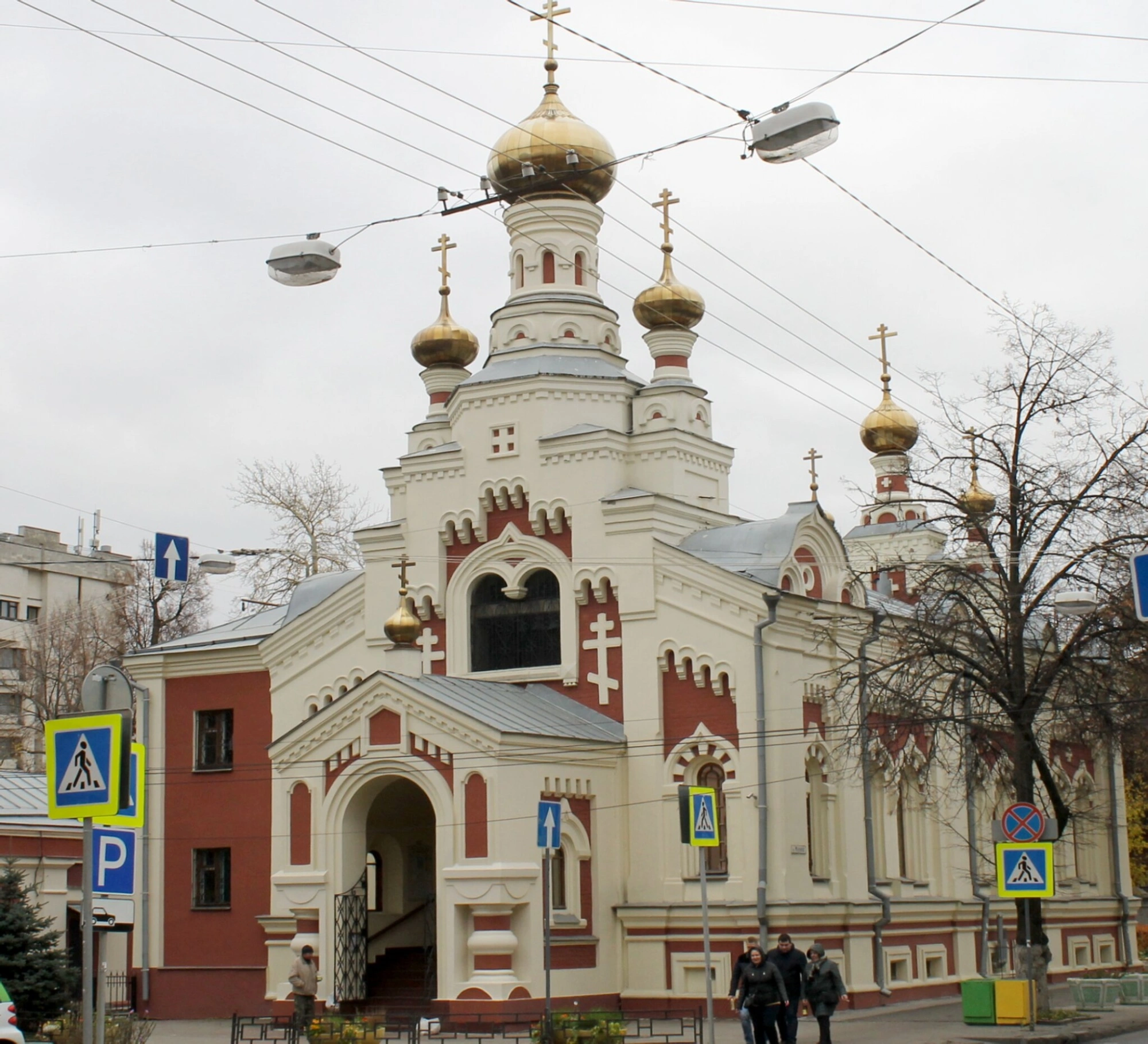 На фотографии запечатлён старинный храм в честь иконы Божией Матери «Всех скорбящих Радость», расположенный в исторической части Нижнего Новгорода на пересечении улиц Нестерова и Минина. Эта православная святыня, освящённая в честь чудотворного образа Пресвятой Богородицы, является одним из значимых духовных центров города.