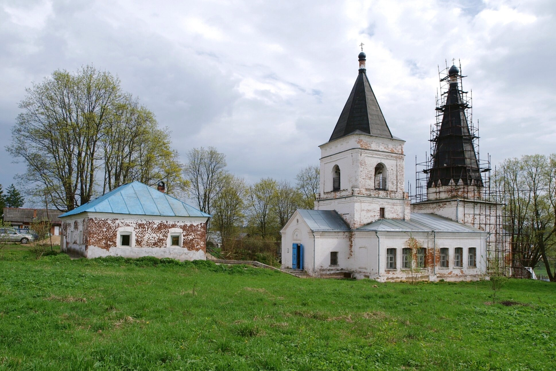 Рядом с главным зданием храма возвышается колокольня, одна из башен которой на момент съёмки была окружена строительными лесами, что свидетельствует о проведении бережных реставрационных работ по сохранению этого духовного и архитектурного памятника. Слева от церкви можно видеть скромное одноэтажное здание под синей кровлей, вероятно, являющееся церковным домом или хозяйственной постройкой, необходимой для жизни прихода.