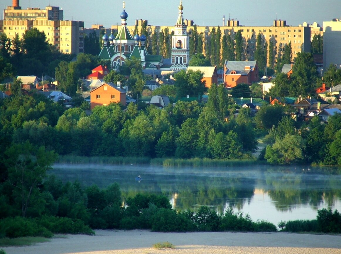На представленной фотографии запечатлён живописный вид на один из самых почитаемых храмов Воронежа — храм в честь иконы Казанской Божией Матери. Снимок сделан с противоположного берега водоёма, что придаёт композиции особую глубину и величие. Спокойная водная гладь, отражающая небесную лазурь, подчёркивает умиротворённость и благодать этого места.