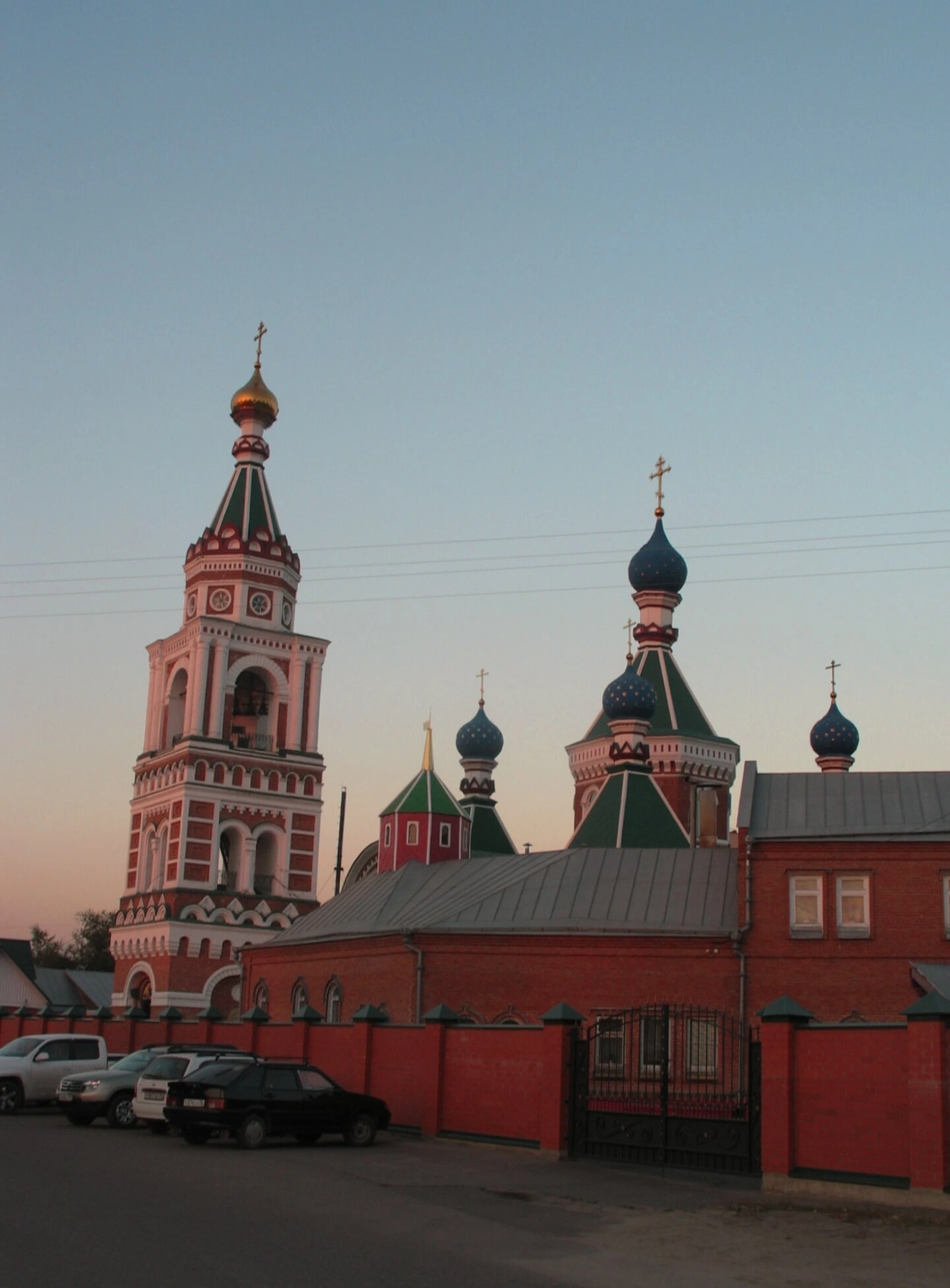 На представленной фотографии запечатлён величественный храм в честь Казанской иконы Божией Матери, расположенный в Воронеже на улице Суворова, в историческом районе, ранее известном как село Отрожки. Святыня, возведённая из красного кирпича, является ярким образцом русского церковного зодчества рубежа XIX–XX столетий.