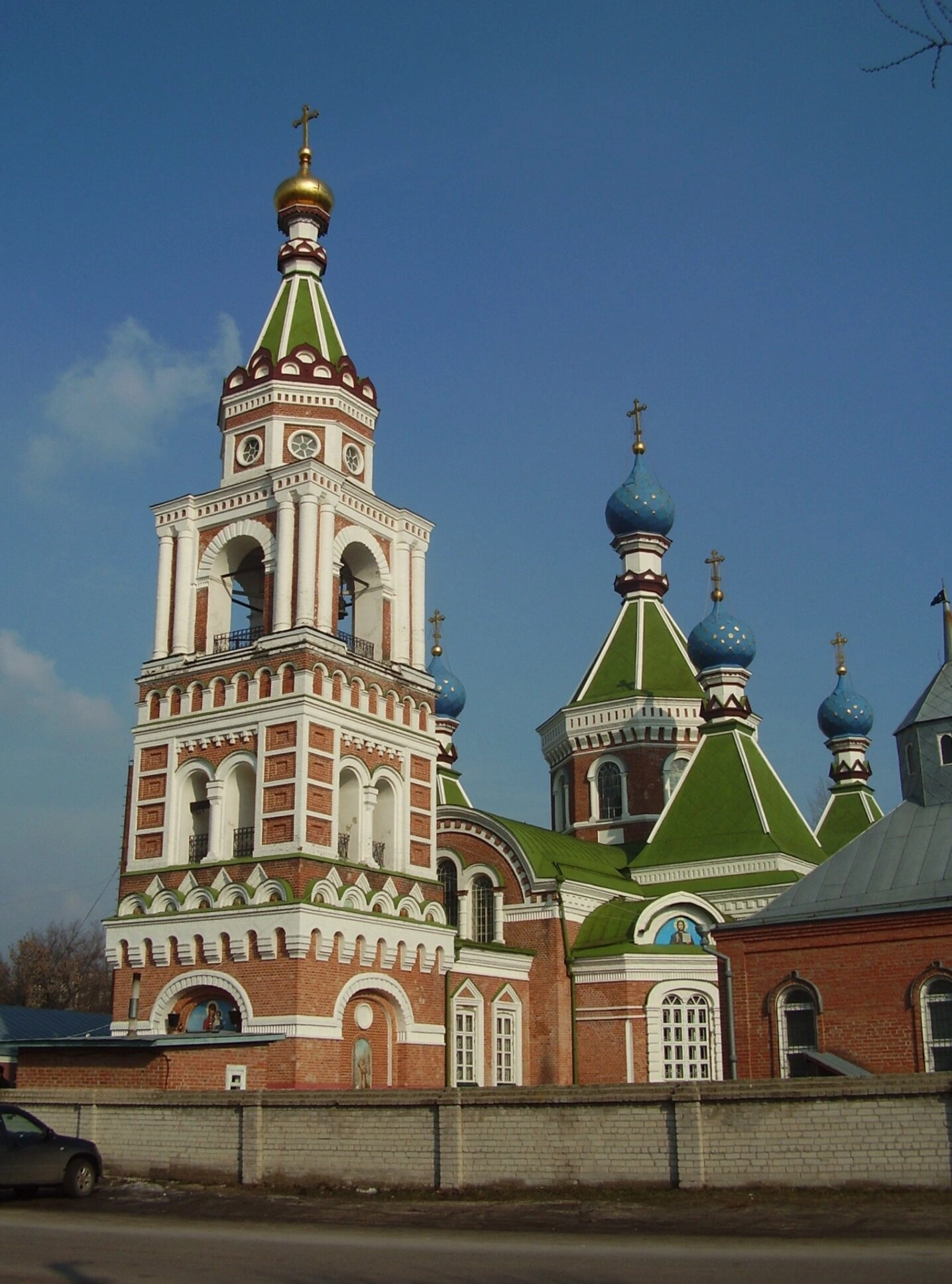 Архитектура храма представляет собой образец русского церковного зодчества начала XX века. На фотографии хорошо просматривается стройная колокольня, увенчанная куполом, и основной объём храма с характерным православным завершением. Белоснежные стены и синие купола создают гармоничный образ, устремлённый в небеса.
