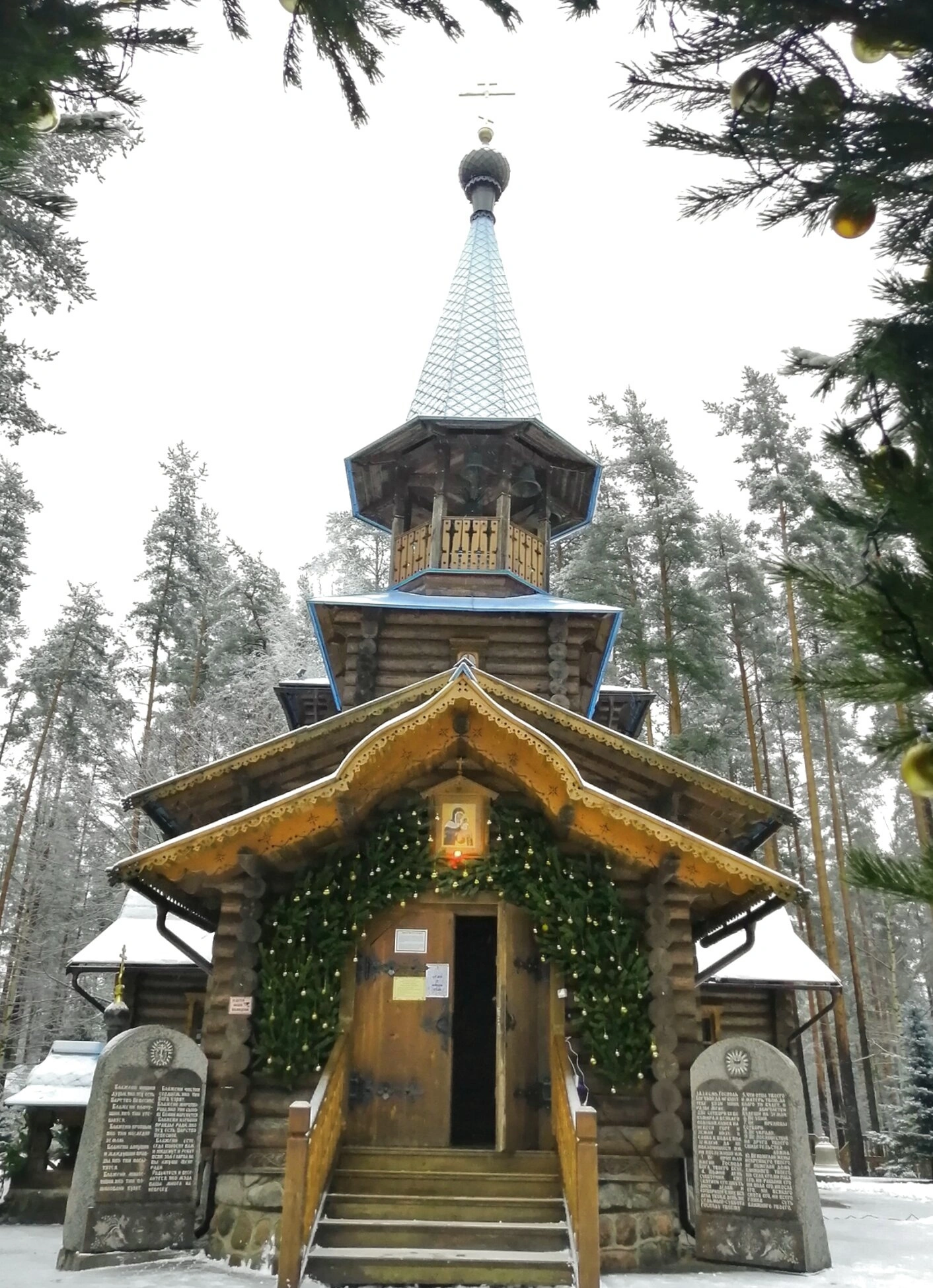 На фотографии запечатлен храм в честь Коневской иконы Божией Матери, расположенный в поселке Саперное Приозерского района Ленинградской области. Святыня возведена на Карельском перешейке, в живописном месте, окруженном хвойными лесами. Зимний пейзаж придает церковному комплексу особую благодать и величие, подчеркивая гармонию божественного творения и рук человеческих.