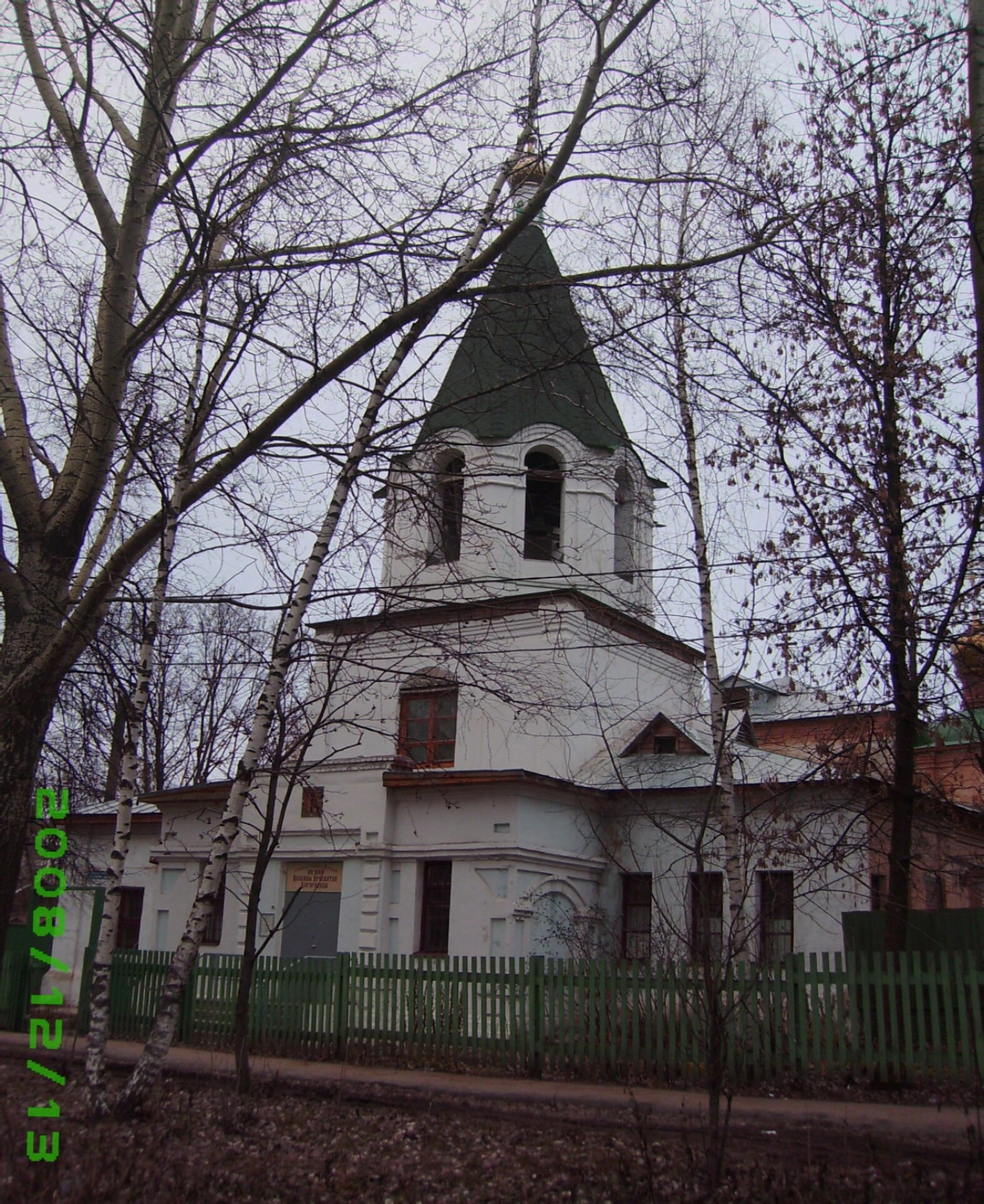 Снимок сделан в осенне-зимний период, о чём свидетельствуют деревья с оголёнными ветвями, окружающие церковную территорию. Перед фасадом храма виднеется скромный зелёный забор, характерный для церковных оград. Цифровая помета в нижней части кадра указывает на дату создания фотографического изображения.