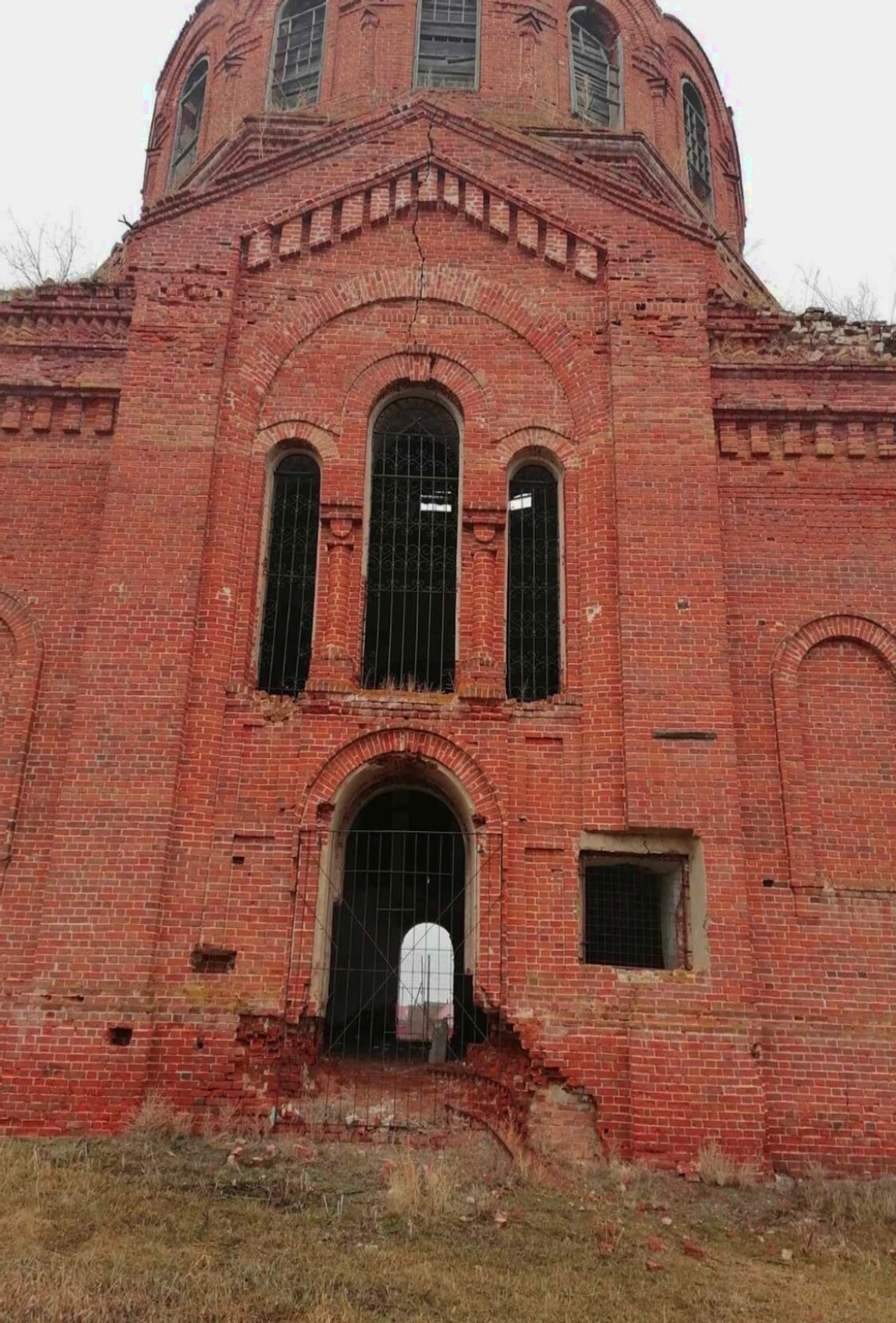 На представленной фотографии запечатлён фасад православного храма, освящённого в честь Покрова Пресвятой Богородицы. Здание, возведённое полностью из красного кирпича, ныне пребывает в скорбном, полуразрушенном состоянии, являя собой образец забвения. Его стены, испещрённые глубокими трещинами, особенно над центральными оконными проёмами, безмолвно свидетельствуют о прошедших годах запустения.