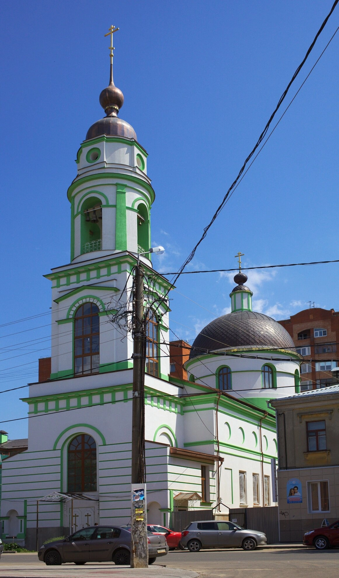 На представленной фотографии запечатлён храм в честь святого Василия Блаженного, расположенный в исторической части города Калуги. Этот православный храм является значимым духовным центром и памятником церковной архитектуры.