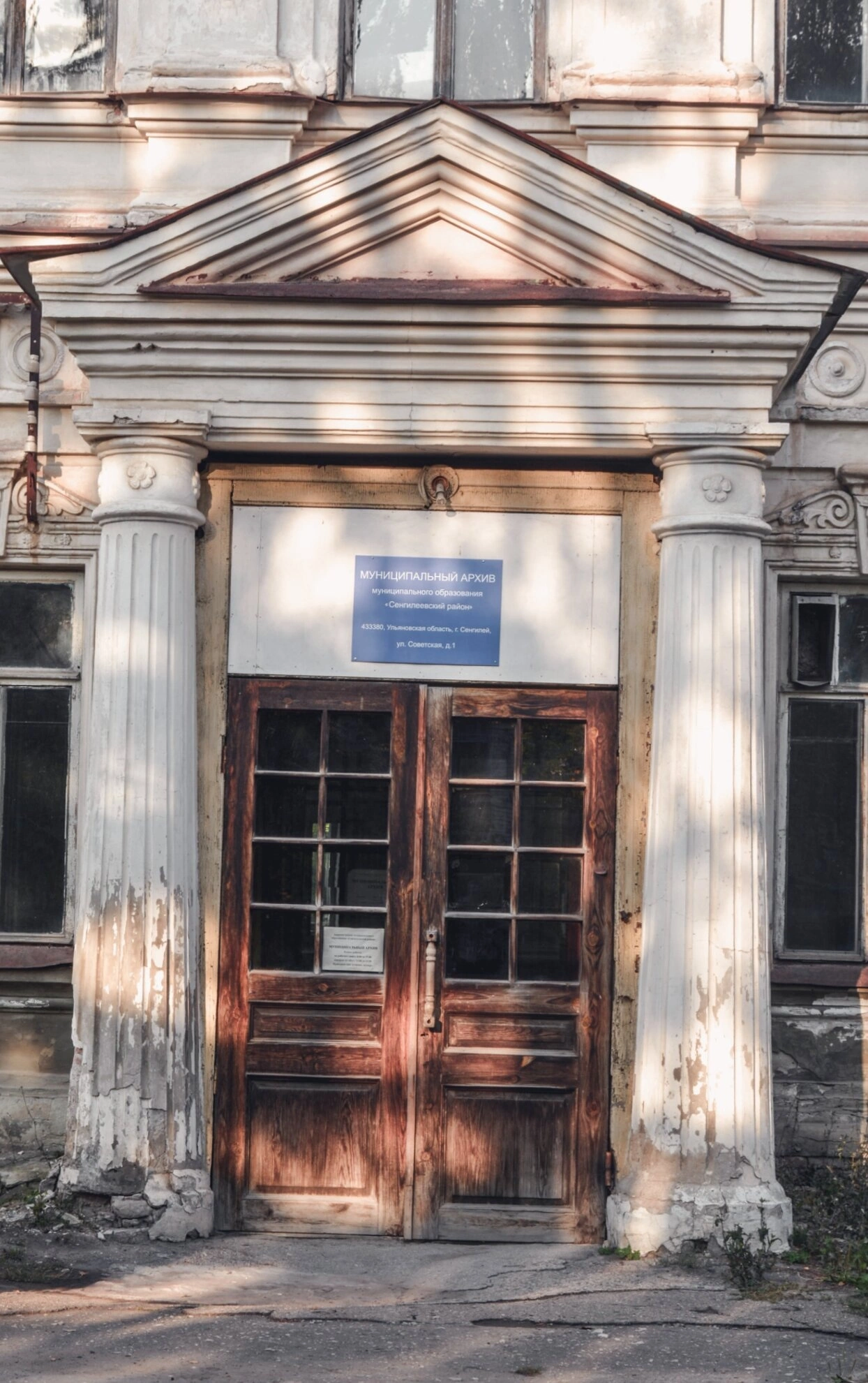 Центральным элементом композиции служит входная группа с массивными двустворчатыми дверями, каждая створка которых украшена шестью стеклянными вставками. Вход обрамлён двумя колоннами с капителями, поддерживающими треугольный фронтон, что характерно для классических архитектурных традиций. Над вратами храма размещена табличка с наименованием "МУНИЦИПАЛЬНЫЙ АРХИВ", свидетельствующая о светском использовании здания в советский период.