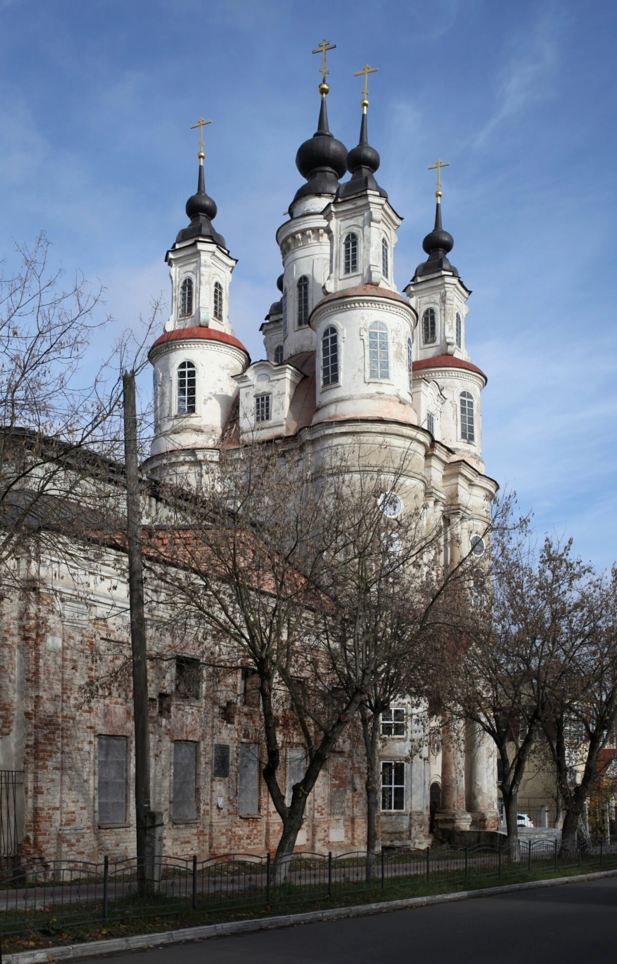 На снимке можно наблюдать современное состояние святыни. Нижний ярус здания требует реставрационных работ: заметны следы облупившейся штукатурки, обнажившей кирпичную кладку. Окна первого этажа заколочены, что свидетельствует о неполном использовании помещений храма. Голые деревья на переднем плане указывают на осенне-зимний период съёмки.