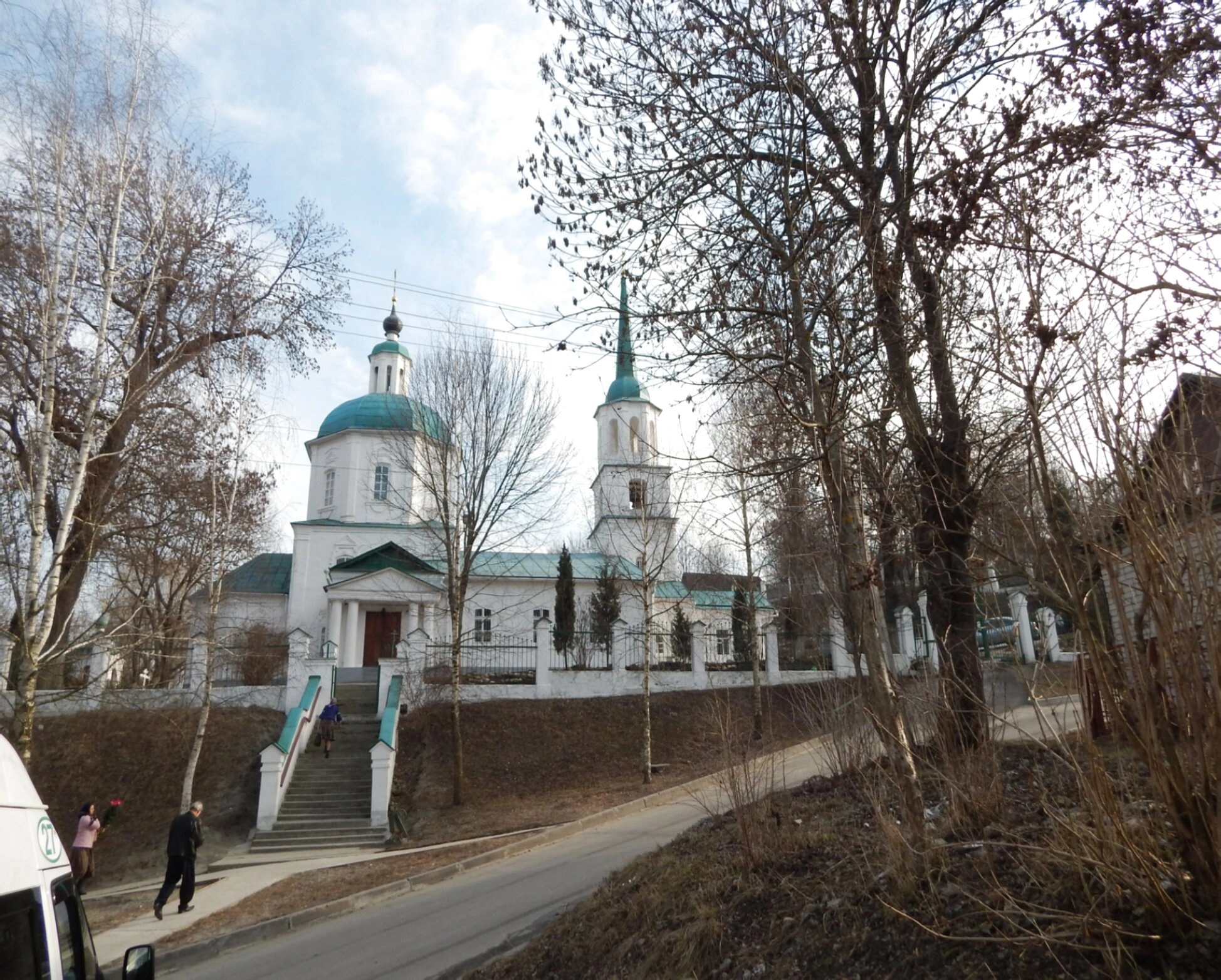 Окружающий пейзаж, с голыми ветвями деревьев, указывает на время года – позднюю осень или раннюю весну. Пасмурное небо создаёт мягкое, рассеянное освещение, которое подчёркивает чистоту линий храма и его светлый лик. Общая атмосфера фотографии передаёт умиротворение, тишину и благодать, свойственные этому святому месту.