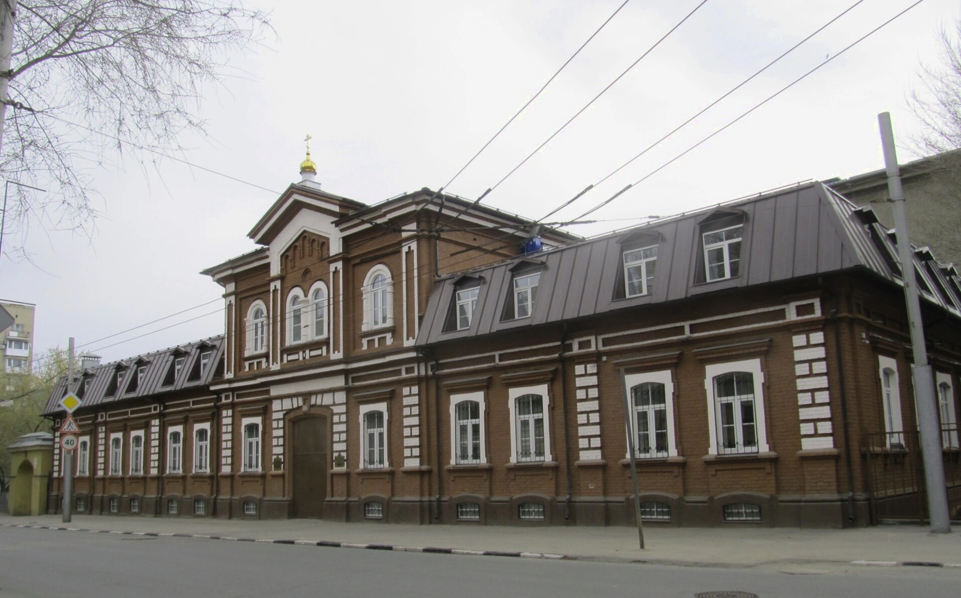 На представленной фотографии запечатлён современный вид Архиерейского подворья – храма в честь Владимирской иконы Божией Матери, расположенного в городе Саратове на улице Лермонтова, дом 14. Двухэтажное здание, выполненное из красного кирпича с выразительными белыми декоративными элементами, являет собою образец благолепного церковного зодчества. Центральная часть храма выделена фронтоном, над которым возвышается небольшой купол, увенчанный святым крестом. Арочные окна второго этажа, обрамлённые белым камнем, и подчёркнутая белой отделкой входная группа придают облику здания торжественность и строгость. Боковые крылья здания с мансардной кровлей и окнами-люкарнами гармонично дополняют архитектурную композицию. Снимок сделан в безлиственный период, вероятно, раннею весною или позднею осенью, на фоне городской улицы, что подчёркивает органичное присутствие дома Божия в повседневной жизни града.