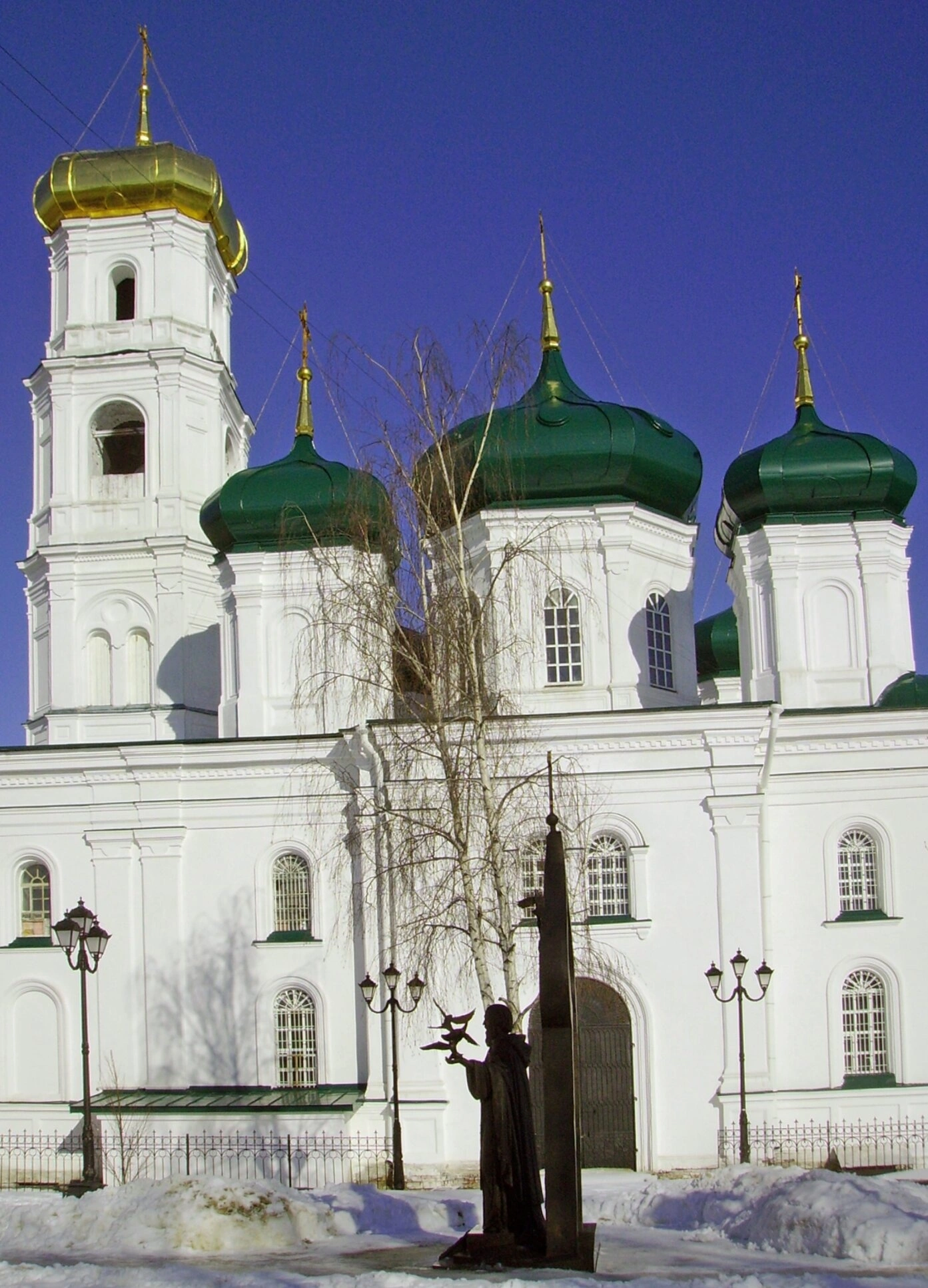 Передний план снимка занимает благоустроенная территория с памятником и оголёнными деревьями, что указывает на зимний период. Это придаёт фотографии особое настроение и позволяет видеть чистые линии храма без листвы. Церковь имеет богатую историю, будучи одним из старейших приходов города. В её стенах хранятся почитаемые святыни, в частности, образ Божией Матери «Неопалимая Купина», который традиционно молятся о защите от пожаров.
