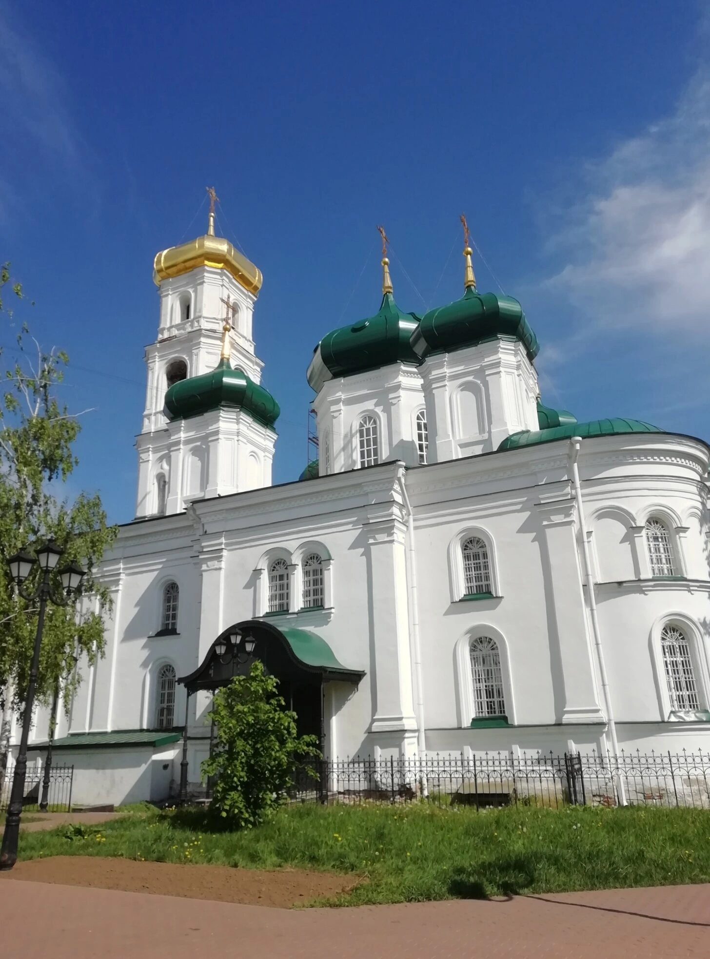 Белоснежные стены храма, символизирующие духовную чистоту и благодать, эффектно контрастируют с зелёными кровлями ярусов и сияющими золотом главками, увенчанными православными крестами. На переднем плане можно наблюдать стройную шатровую колокольню, чей золочёный купол парит над округой, созывая благовестом на молитву. Архитектурный ансамбль отличается гармонией пропорций и свойственной храмовому строительству XIX века детализацией: арочные оконные проёмы с фигурными решётками, изящные кокошники в основании глав и крыльцо с черепичным навесом.