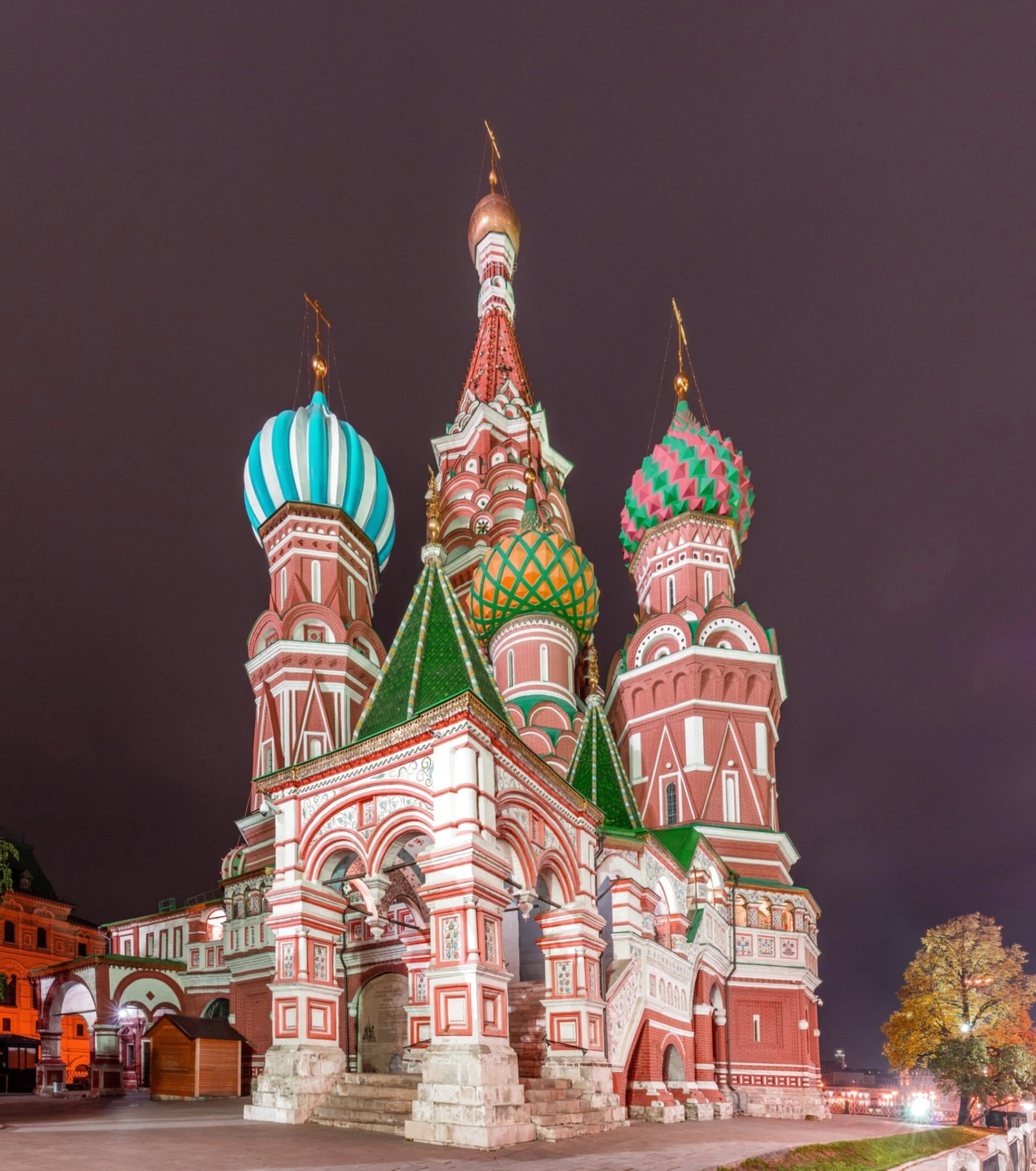На представленной фотографии запечатлен всемирно известный православный храм — собор Покрова Пресвятой Богородицы, что на Рву, более известный как Храм Василия Блаженного. Святыня, возвышающаяся в самом сердце Москвы на Красной площади, предстает в величественном ночном убранстве. Искусственный свет бережно выхватывает из темноты её неповторимый силуэт, созданный по велению царя Ивана Грозного в память о взятии Казани.