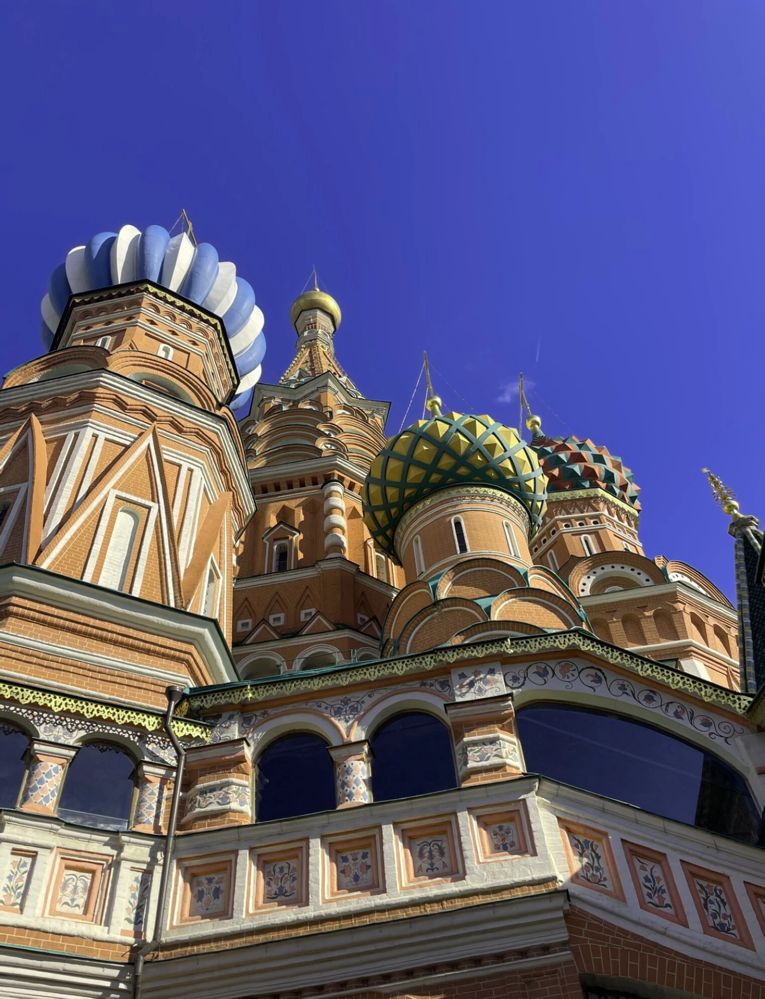 На представленной фотографии запечатлены величественные детали одного из самых узнаваемых символов России — Покровского собора, что на Рву, более известного как Храм Василия Блаженного. Святыня, расположенная на главной площади Москвы, является выдающимся памятником русской православной архитектуры середины XVI столетия.