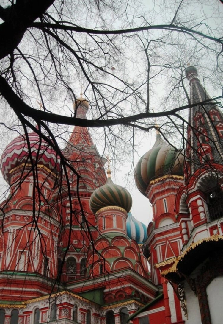 На представленной фотографии запечатлён всемирно известный символ Москвы и России — собор Покрова Пресвятой Богородицы, что на Рву, в народе именуемый храмом Василия Блаженного. Снимок сделан с нижнего ракурса, что позволяет в полной мере ощутить монументальность и духовное величие этого святого места. Взгляд зрителя устремляется ввысь, к ярким, словно горящим на фоне хмурого неба, куполам-луковкам, каждый из которых уникален своим замысловатым узором и цветовым решением. Тёмные ветви деревьев, обрамляющие композицию, подчёркивают торжественную красоту архитектурного шедевра, создавая ощущение сопричастности к вечности.