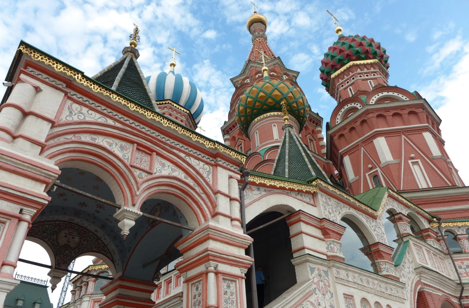 На снимке, выполненном в ракурсе снизу вверх, явственно читается сакральная идея собора как града небесного. Композиция объединяет одиннадцать престолов, из которых девять церквей видны на фото, сгруппированы вокруг центрального шатрового храма в честь Покрова Богородицы. Каждый придел был освящен во имя праздников или святых, дни памяти которых пришлись на ключевые события Казанского похода. Взгляд приковывают изумительные по красоте луковичные главы, сияющие на солнце. Их полихромный убор и сложные узоры — ромбы, спирали, шишечки — приобрели современный вид в XVII–XVIII веках, придя на смену первоначальным позолоченным покрытиям. Каждая глава уникальна и венчает определенный придел, что подчеркивает богословскую сложность и многосоставность всего ансамбля.