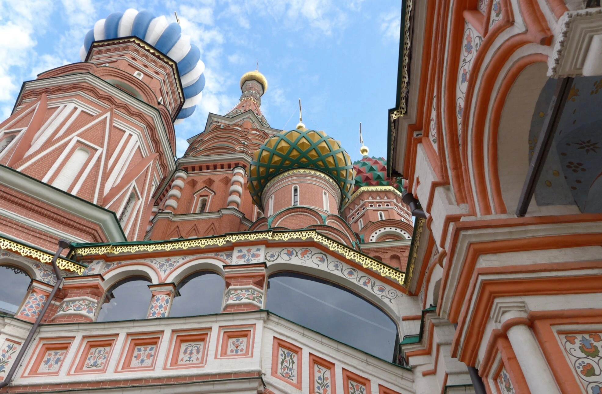 Особое внимание привлекают разноцветные главы собора, каждая из которых венчает отдельный престол. Один из куполов, расположенный слева, украшен строгим спиральным узором в сине-белых тонах. Центральные и правые главы поражают сложнейшей чешуйчатой структурой и богатой палитрой, где сочетаются золоченые, зеленые и багряные оттенки, символизирующие небесную славу и благодать.