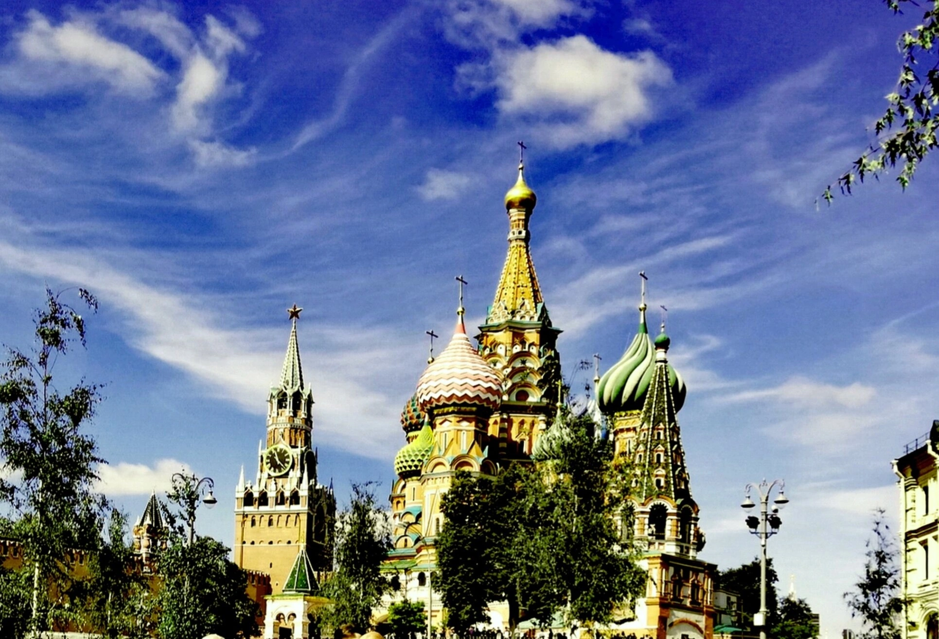 На снимке, сделанном, судя по зелени деревьев, в тёплое время года, храм предстаёт во всей своей красе на фоне ясного неба. Слева от него возвышается Спасская башня Кремля с её знаменитыми курантами. В нижней части кадра можно наблюдать элементы городского убранства и небольшие группы людей, что подчёркивает масштаб и значимость этого места как для паломников, так и для всех гостей столицы. Этот архитектурный шедевр является не только действующим православным храмом, но и объектом всемирного наследия ЮНЕСКО.