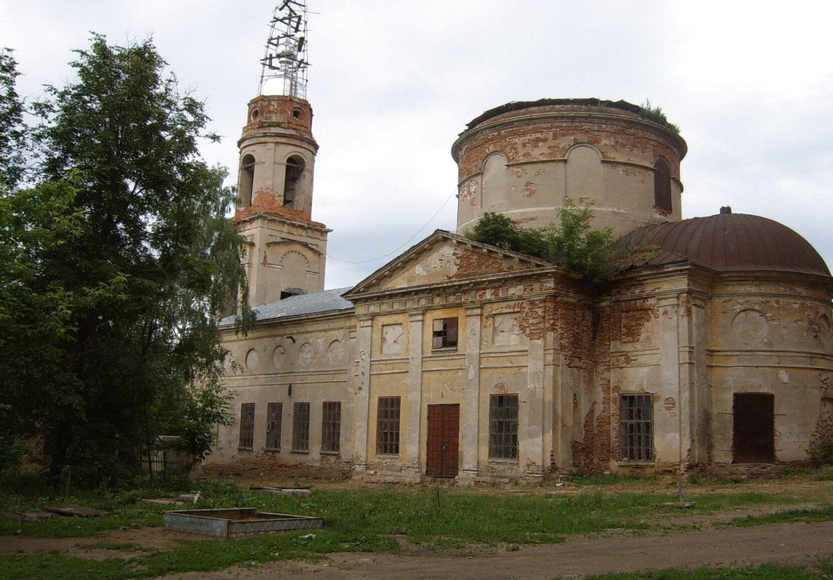 Здание храма представляет собой кирпичную постройку, выполненную в традициях русского церковного зодчества. Архитектурный ансамбль включает в себя основной объём, увенчанный куполом, и высокую колокольню, которая на момент съёмки находилась на реставрации, что видно по установленным строительным лесам. Фасад здания несёт на себе следы времени, что придаёт ему особый, благоговейный вид.