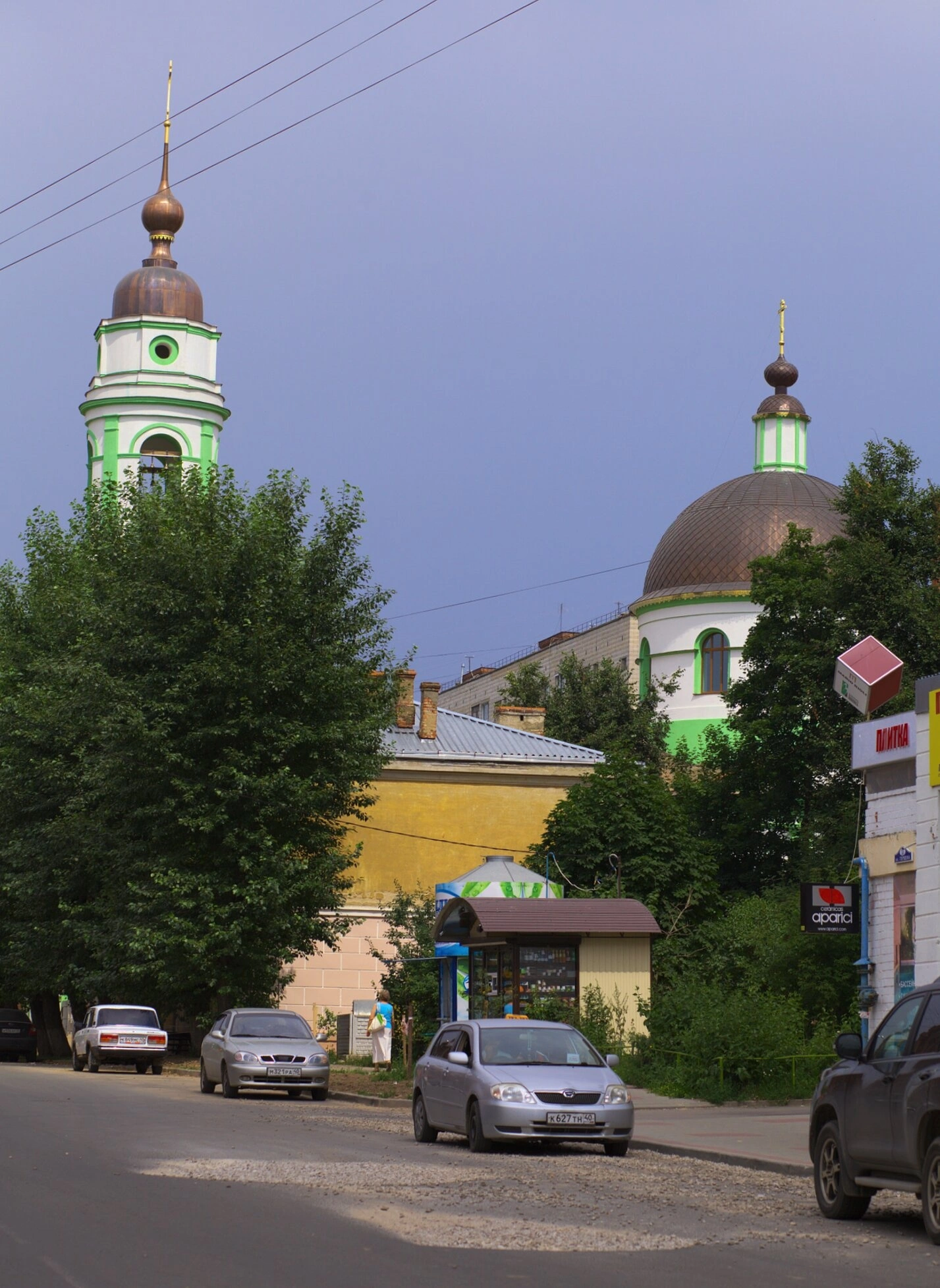 По обеим сторонам от храма расположены городские здания и деревья, которые обрамляют церковные постройки, добавляя пейзажу глубины и естественности. На одном из зданий заметна вывеска, свидетельствующая о коммерческой деятельности, что характерно для центральных городских улиц. Данный снимок не только передаёт архитектурную уникальность храма, но и отражает его неотъемлемую роль в повседневной жизни города, оставаясь духовным центром и местом молитвы для верующих.