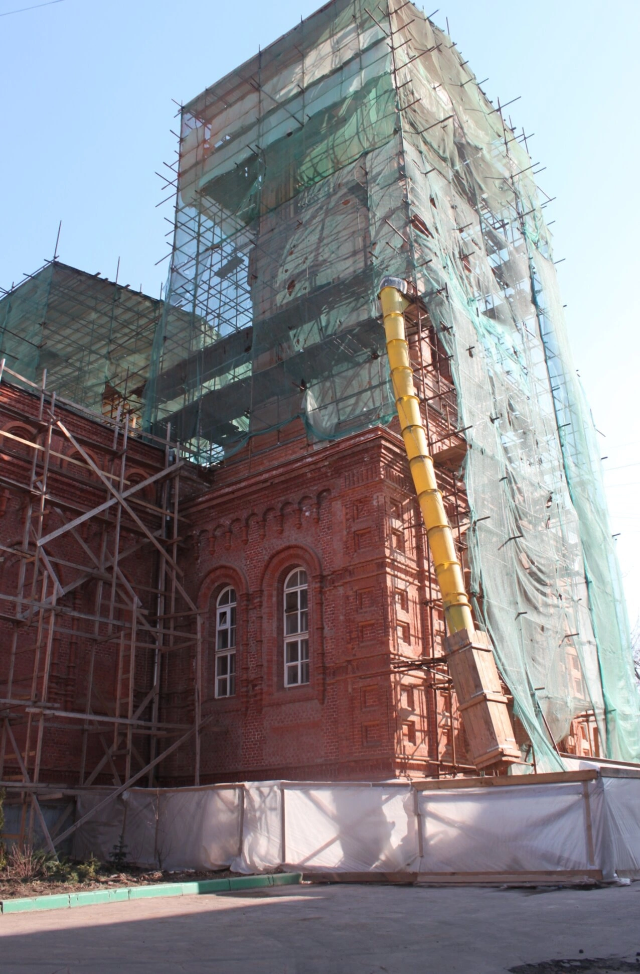 На представленной фотографии запечатлён храм во имя святого Василия Исповедника, что у Рогожской заставы в Москве, в период проведения реставрационных работ. Святыня, окружённая строительными лесами и защитной сеткой, свидетельствует о продолжающихся трудах по восстановлению её исторического облика.