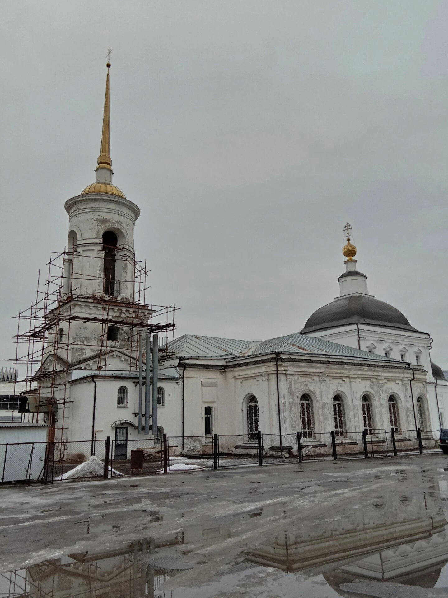 С левой стороны к основному зданию примыкает колокольня, чей высокий шпиль, устремлённый в небо, также венчает крест. Часть колокольни покрыта строительными лесами, что свидетельствует о ведущихся трудах по её восстановлению и украшению, дабы Дом сей продолжал служить верным многие лета. На заднем плане виднеются городские строения, напоминающие о том, что храм находится в живом средоточии городской жизни, являясь духовной твердыней для православных христиан.