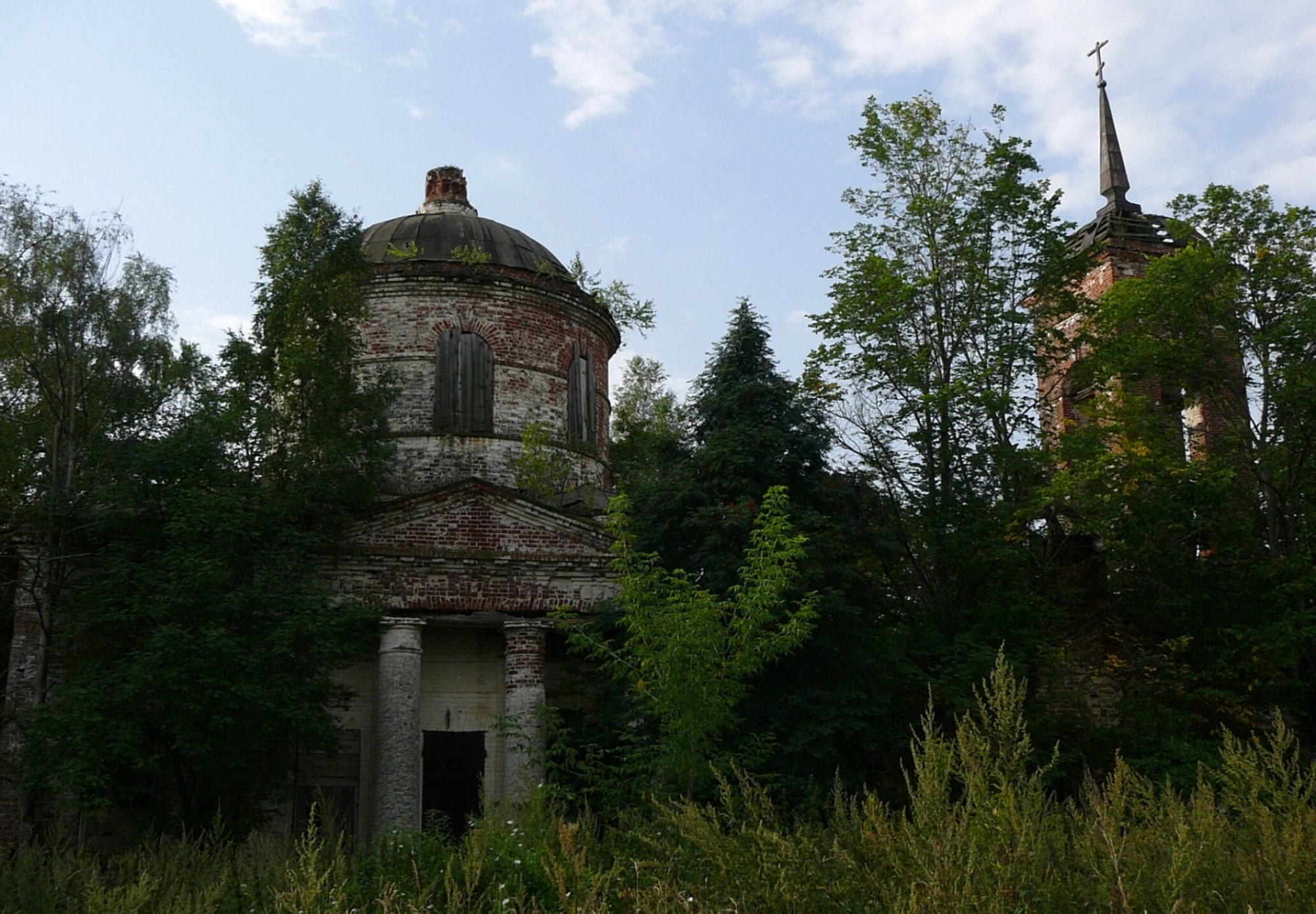На изображении видно нынешнее состояние храма, пребывающего в значительной степени разрушения. Наиболее сохранились главный престол и колокольня, в то время как средняя часть храмового пространства пострадала существенно. Под куполом частично уцелели росписи XIX века, напоминающие о былом благолепии этого священного места. Несмотря на запустение, в последнее время предпринимаются усилия по возрождению храма, где уже проводятся богослужения после многолетнего перерыва.