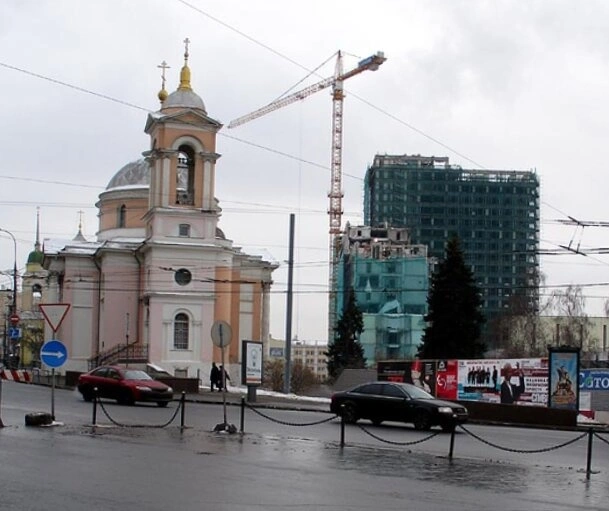 За святыней можно наблюдать здания, находящиеся в процессе реконструкции или строительства, одно из которых скрыто строительными лесами, а другое обладает современным стеклянным фасадом. Над всем этим возвышается стрела строительного крана, символизирующая непрерывное развитие города вокруг древних духовных центров. Пасмурное небо с облаками добавляет снимку особое настроение, подчёркивая монументальность и вечность православной святыни в самом сердце столицы.