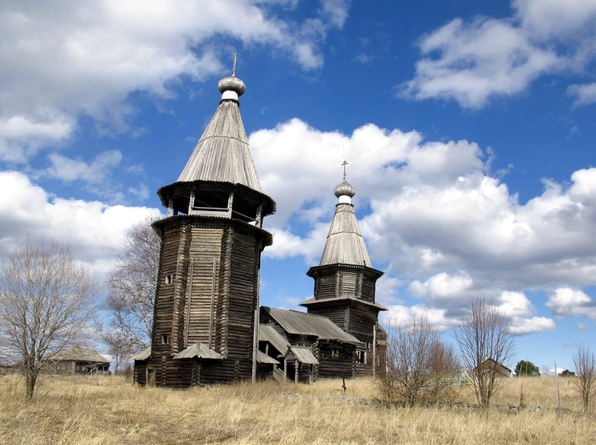 На представленной фотографии запечатлён старинный православный храм во имя святой великомученицы Варвары, расположенный в деревне Яндомозеро на территории Карелии. Этот уникальный памятник деревянного зодчества был возведён в 1656 году и является одним из немногих сохранившихся до наших дней образцов древней церковной архитектуры Русского Севера.