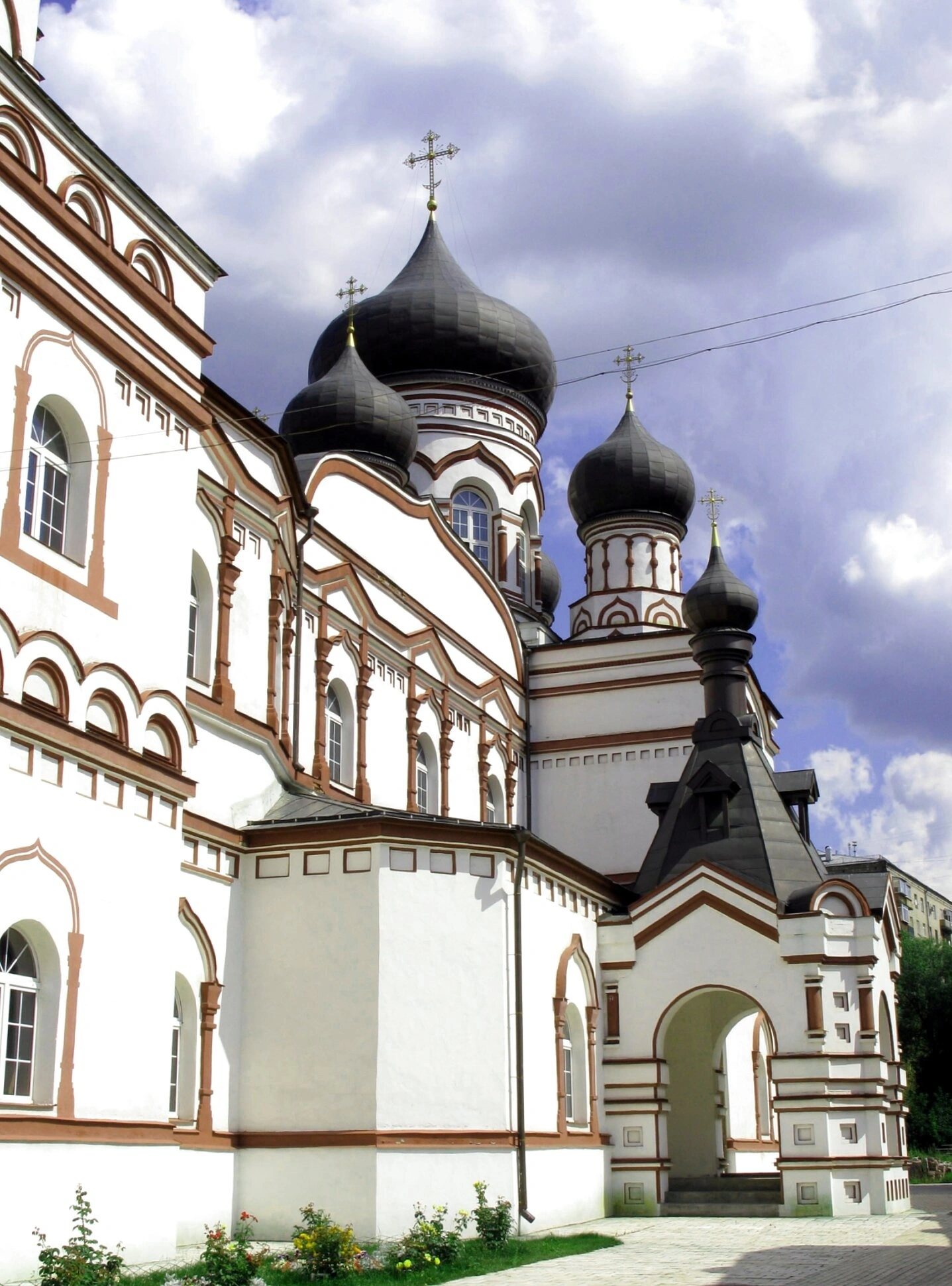 Белоснежный объём храма, увенчанный несколькими чёрными главами с сияющими золотыми крестами, создаёт яркий и запоминающийся образ. Наружное убранство фасадов отличает благородное сочетание белого цвета стен и красно-коричневых декоративных элементов, наличников арочных окон. Внимательный взгляд отмечает тщательную проработку деталей: колонны, резные карнизы и иные архитектурные особенности, придающие всему облику храма сложность и нарядность.