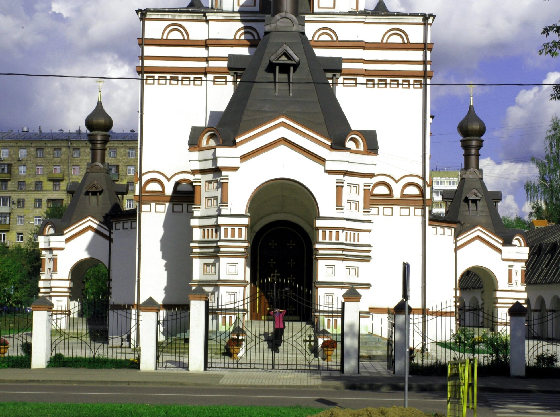 На заднем плане открывается вид на жилую застройку и кроны деревьев, что напоминает о том, что храм является неотъемлемой частью жизни православной общины и духовным центром для жителей столицы. Фигура человека у входа придаёт снимку особый масштаб и живую, молитвенную атмосферу. Небесный свод с облаками простирается над обителью, как символ Промысла Божия и благословения. Данный храм, возрождённый в постсоветское время, ныне является объектом культурного наследия и одной из духовных жемчужин Восточного административного округа Москвы.