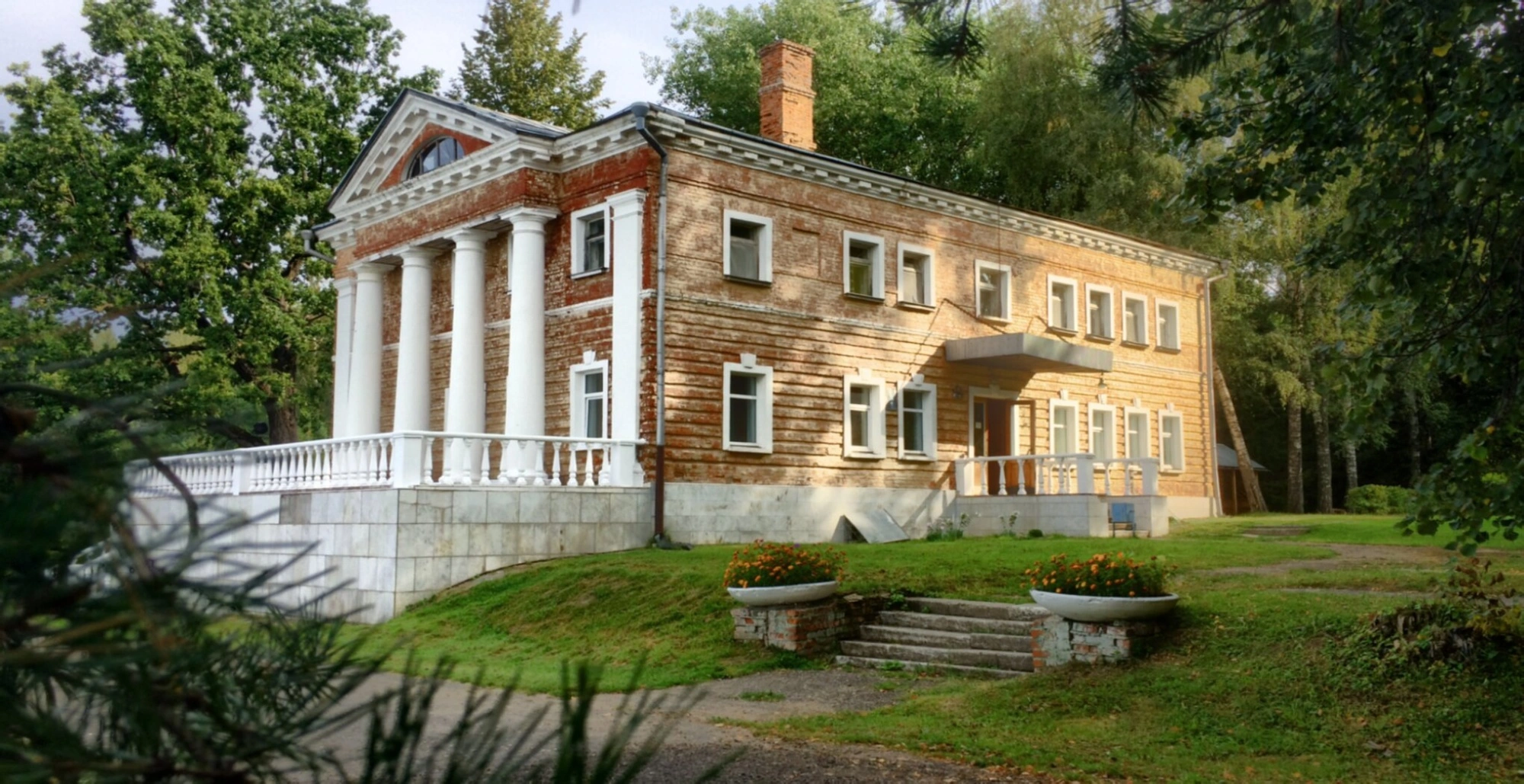 На представленной фотографии запечатлен храм в честь святого великомученика Димитрия Солунского, расположенный в селе Ивакино Можайского района Московской области. Святыня представляет собой двухэтажное кирпичное здание, выполненное в стиле классицизма с характерным белым портиком и колоннами, что придает ему вид усадебного дома.