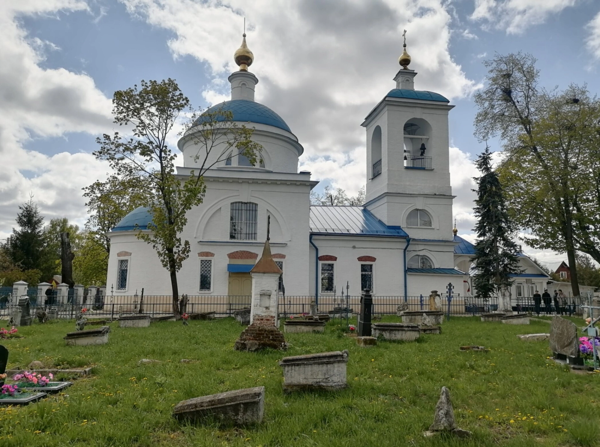 Храм окружает древнее сельское кладбище, где покоятся благочестивые предки. Старинные надгробия, некоторые из которых уже потемнели от времени, являются немыми свидетелями многих поколений, находивших утешение в молитвах в этом святом месте. Зеленая трава и деревья с нежной листвой подчеркивают атмосферу вечного покоя и тихого молитвенного созерцания.