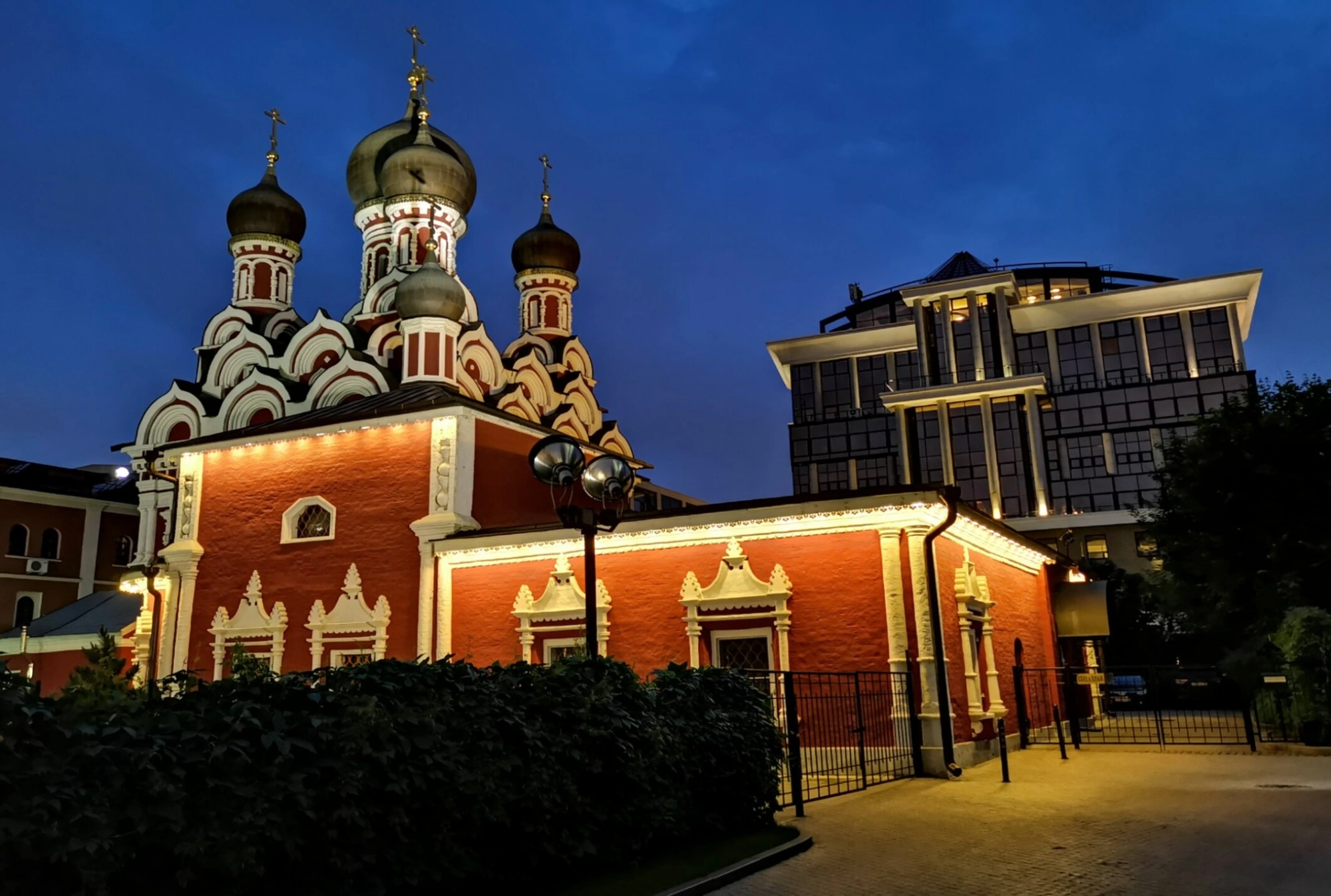 На представленной фотографии запечатлён храм великомученика Георгия Победоносца, что на Псковской горе в местечке Ендова. Святыня расположена в историческом центре Москвы, вблизи слияния Москвы-реки и Водоотводного канала. Вечерняя подсветка мягко высвечивает великолепный белоснежный фасад и зелёные кровли, подчёркивая изящные детали и формы, характерные для русского узорочья середины XVII века.