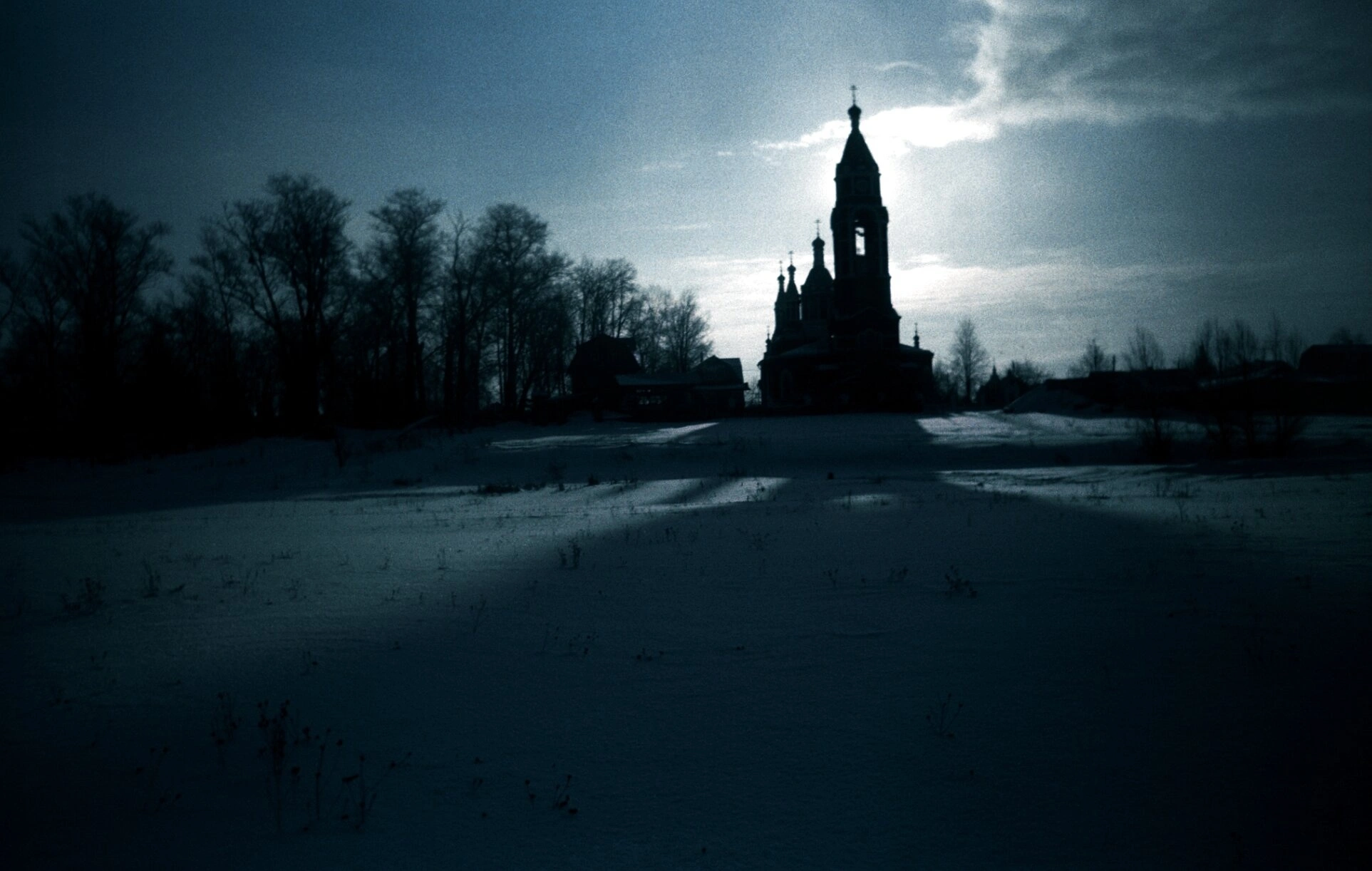 Белоснежные стены церкви и изящная колокольня эффектно выделяются на фоне тёмного зимнего неба, символизируя собой свет веры и надежды. Тёплый свет из окон и подворье, покрытое, вероятно, снегом, дополняют картину, наполняя её тихим и спокойным величием, характерным для православных святынь.