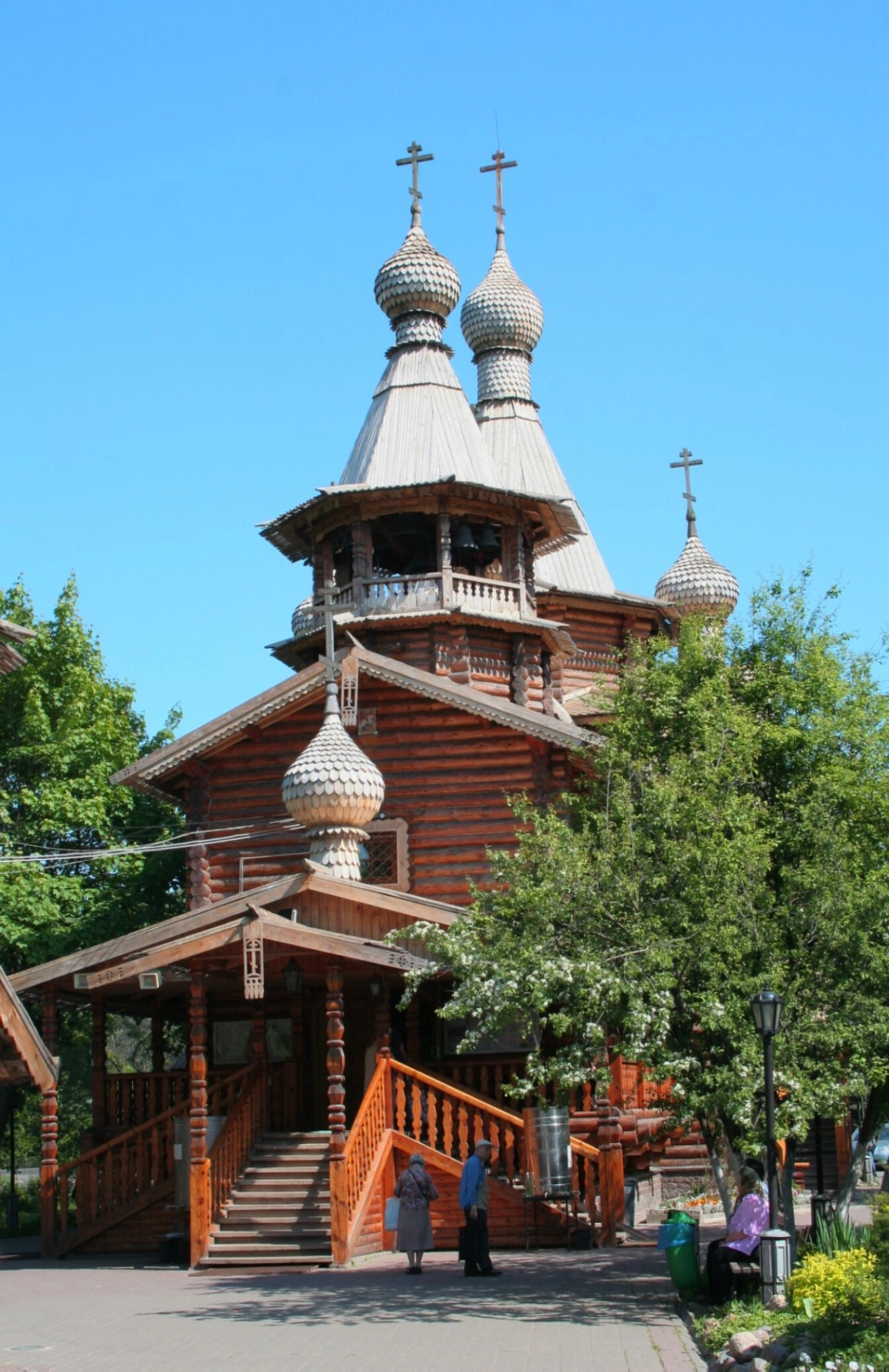 На представленной фотографии запечатлен деревянный храм в честь святого великомученика Георгия Победоносца, расположенный в московском районе Коптево. Этот православный храм был возведен в 1997 году по благословению Святейшего Патриарха Алексия II и представляет собой прекрасный образец современного деревянного зодчества, выполненного в лучших традициях русского церковного строительства.