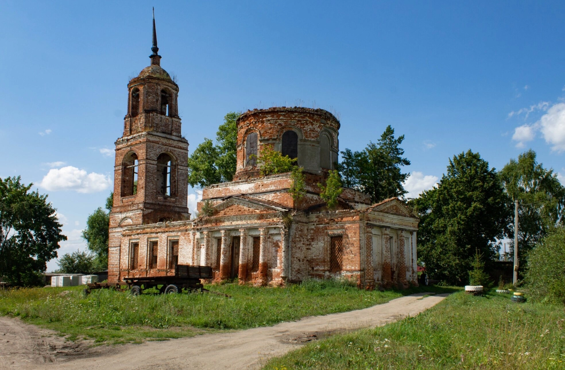 На представленной фотографии запечатлён храм в честь святого великомученика Георгия Победоносца, расположенный в селе Георгиевское Кинешемского района Ивановской области. Святыня, возведённая из красного кирпича, ныне пребывает в полуразрушенном состоянии, являясь молчаливым свидетелем былой эпохи и объектом историко-культурного наследия.