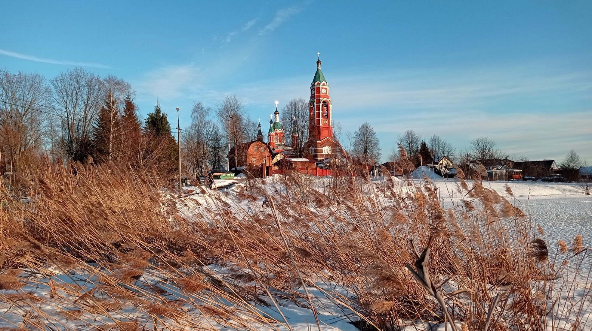 На переднем плане виднеются заснеженные полевые просторы с поблёкшей растительностью, что лишь подчёркивает торжественную строгость и величие церковного строения. Центром композиции является сам храм с тёмно-красными стенами, увенчанными зелёными куполами, символом небесной славы, и высокой колокольней, чей шпиль устремлён ввысь. Безмолвные деревья с оголёнными ветвями окружают церковь, храня её покой в тишине зимнего дня.