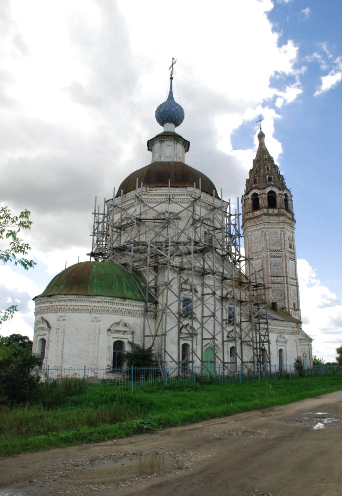 Здание храма, построенное в традициях русского зодчества с элементами барокко, находится под охраной государства. В момент съёмки святыня окружена строительными лесами, что красноречиво говорит о проведении масштабных реставрационных или консервационных работ. Эти усилия направлены на сохранение уникального памятника для будущих поколений.