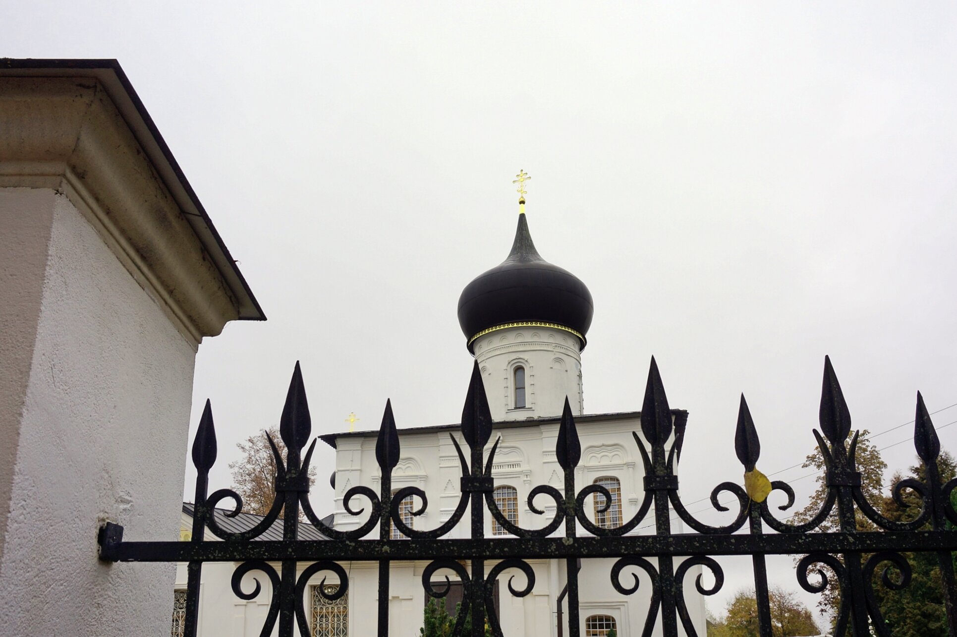 На переднем плане изображения внимание приковывает изящная кованая ограда с остроконечными пиками, ограждающая святую территорию храма. Эта деталь подчёркивает особый статус места и придаёт комплексу законченный и гармоничный вид. Слева от ограды виден фрагмент ещё одного светлого строения, вероятно, относящегося к церковному подворью.