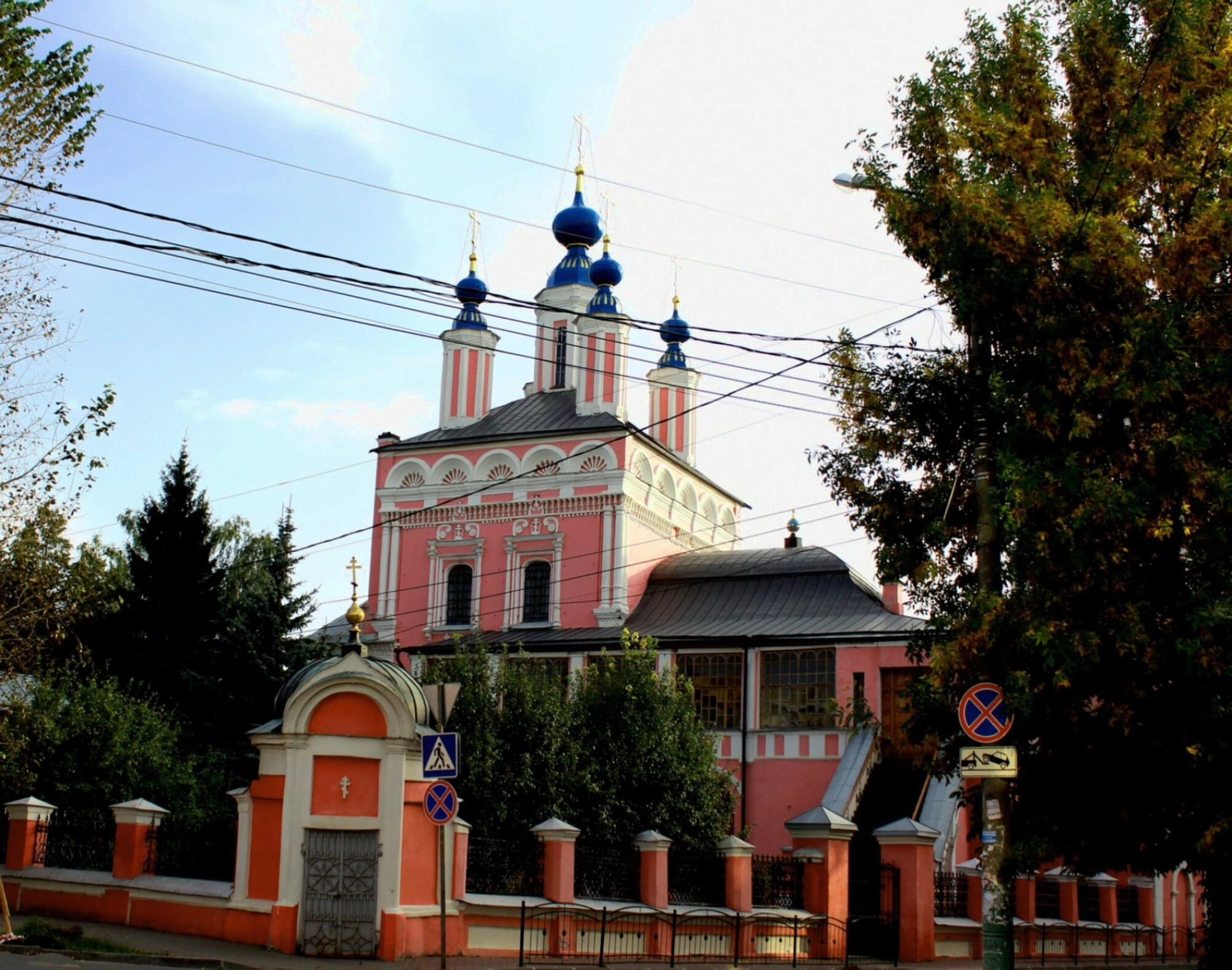 Величественное здание церкви, выполненное в тёплых розовых тонах с белоснежными декоративными элементами и нарядными синими куполами, увенчанными золочёными крестами, является ярким образцом русского церковного зодчества. На переднем плане фотографии видна ажурная ограда, ограждающая церковную территорию, и входные ворота, приглашающие верующих под свои своды. Храм гармонично вписан в окружающий природный ландшафт: его окружают высокие деревья, которые летом укрывают его своей зеленой сенью, подчёркивая умиротворённую и духовную атмосферу этого места.