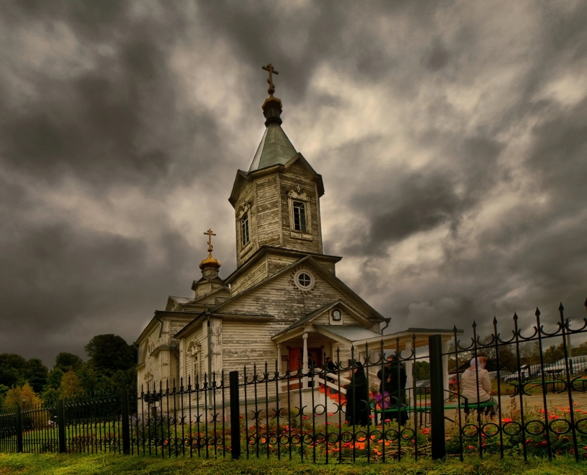 Храм окружён ажурным кованым ограждением, под сенью которого располагаются ухоженные цветочные клумбы с алыми цветами. На переднем плане фотографии видна группа прихожан, что свидетельствует о продолжающейся церковной жизни. С юго-восточной стороны к церковному двору подступает кедровый лес, создающий естественную защиту и особую молитвенную атмосферу.