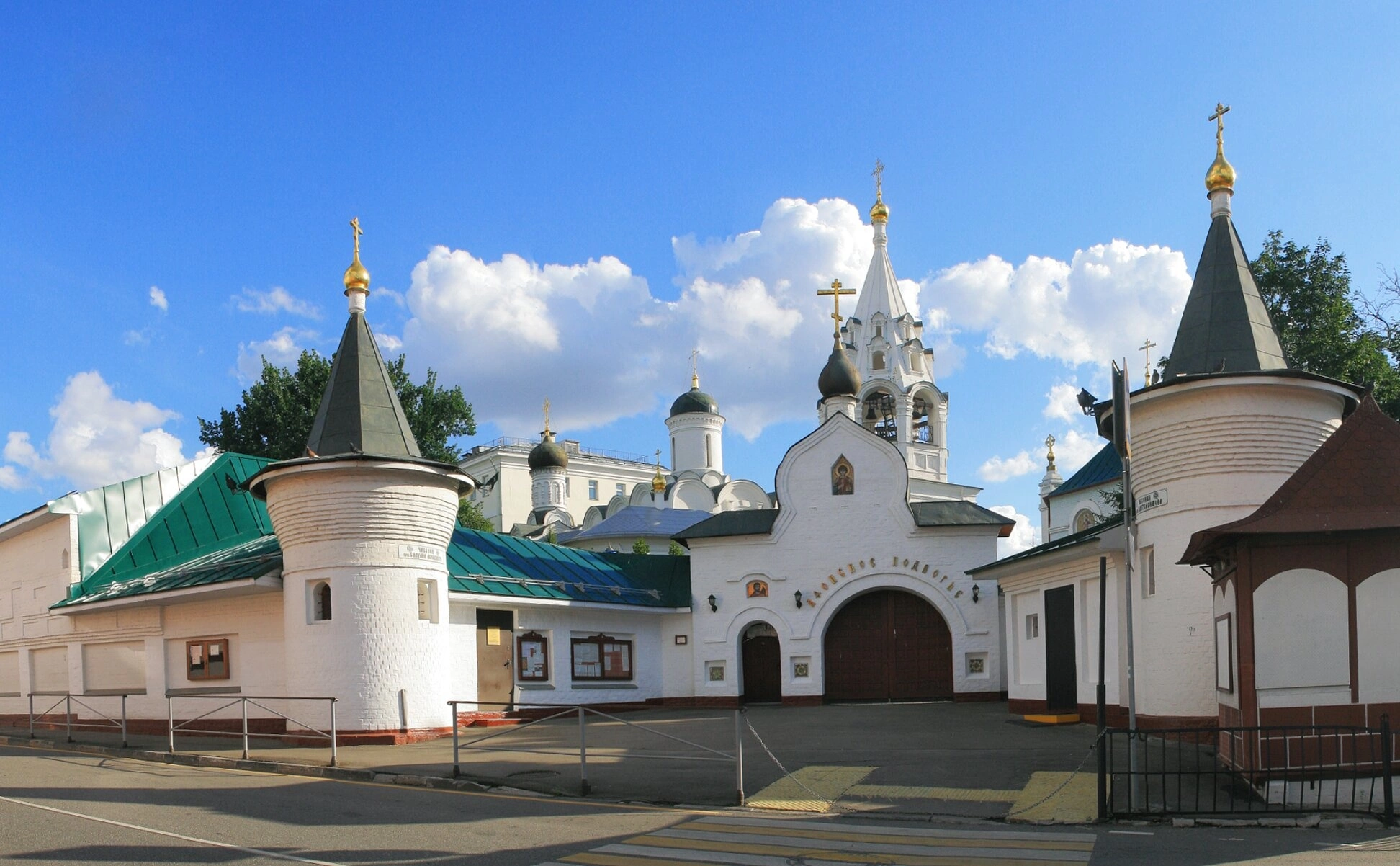 На фотографии запечатлён архитектурный ансамбль Подворья Афонского Свято-Пантелеимонова монастыря в Москве, исторически известного как храм Великомученика Никиты на Швивой горке за Яузой. Святая обитель расположена в одном из древнейших районов столицы — Заяузье, на высоком берегу реки Яузы.