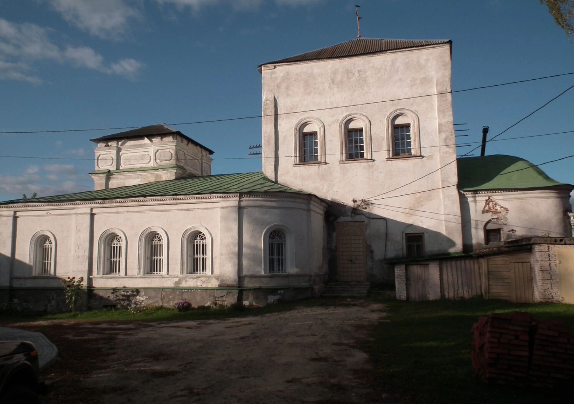 Фотография передаёт умиротворённую атмосферу этого намоленного места. Голубое небо с легкими облаками, грунтовая дорога, ведущая к входу, и зелёные участки вокруг подчёркивают гармонию рукотворной красоты храма и окружающего божьего мира. Этот образ является ценным свидетельством исторического и духовного наследия древней Коломны.