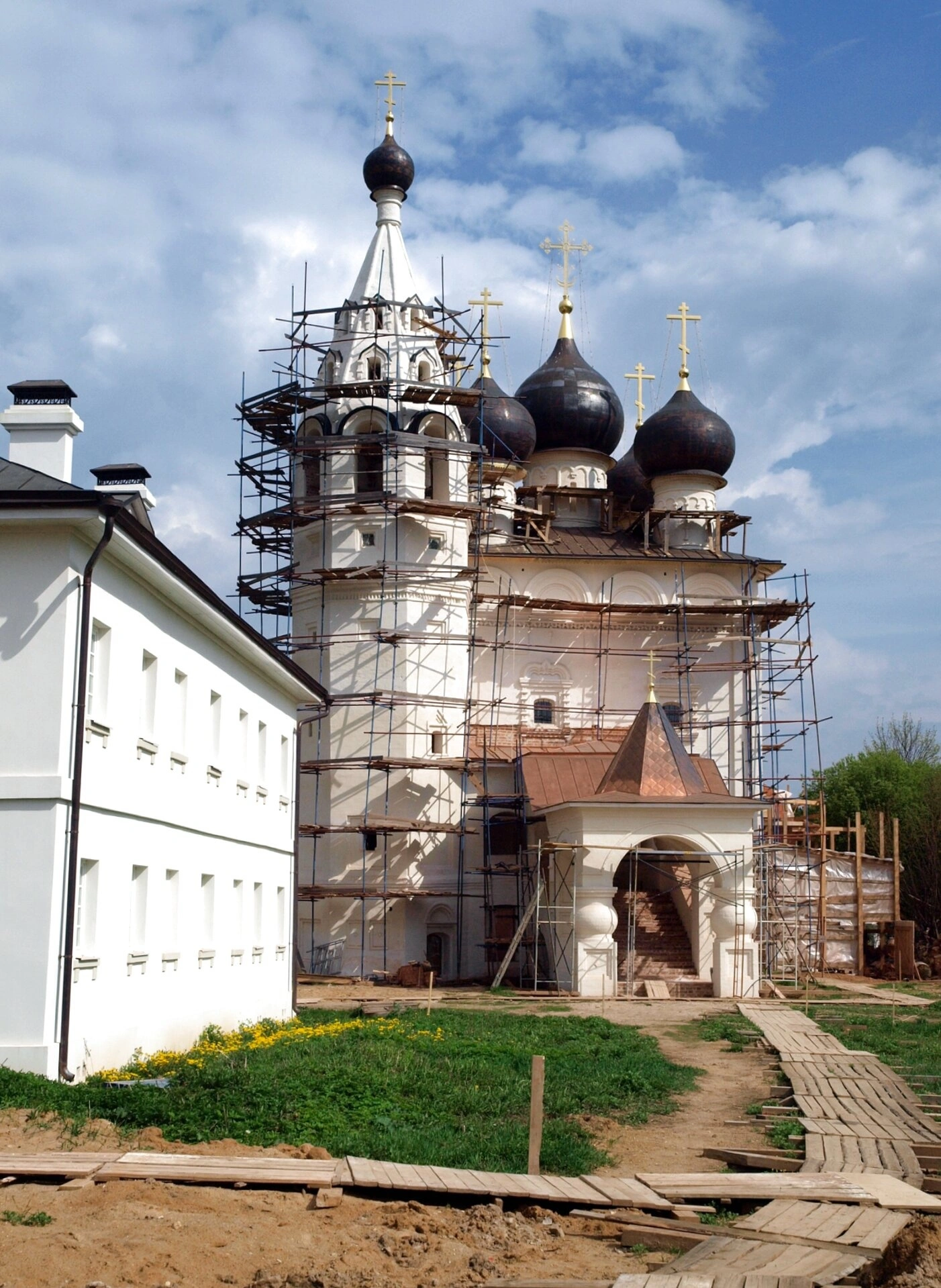 Белоснежные стены и зелёные кровли храма эффектно выделяются на фоне летнего неба с облаками. Справа от основного здания видно одноэтажное каменное строение с зелёной крышей, которое является частью церковной инфраструктуры. На переднем плане заметны следы благоустиройства территории: деревянные настилы и проведённые земляные работы, что указывает на комплексный подход к возрождению всей святыни.