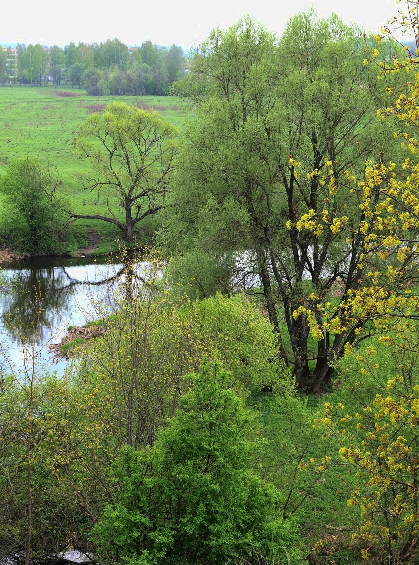 Весенняя природа окружает храм пышным убранством: молодой листва деревьев и цветущие кустарники обрамляют святое место. Река Протва, несущая свои спокойные воды у подножия холма, отражает небесную лазурь и добавляет пейзажу особую благодать. На дальнем плане виднеются просторы полей и очертания городских строений.