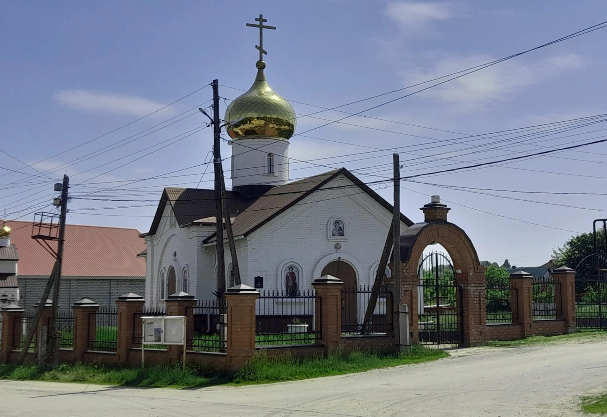 На переднем плане фотографии видны грунтовая дорога и зелёная трава. Вокруг храма проходят линии электропередач с деревянными и металлическими опорами. На заднем плане слева заметны другие сельские постройки с красными крышами. Людей крупным планом на снимке нет.