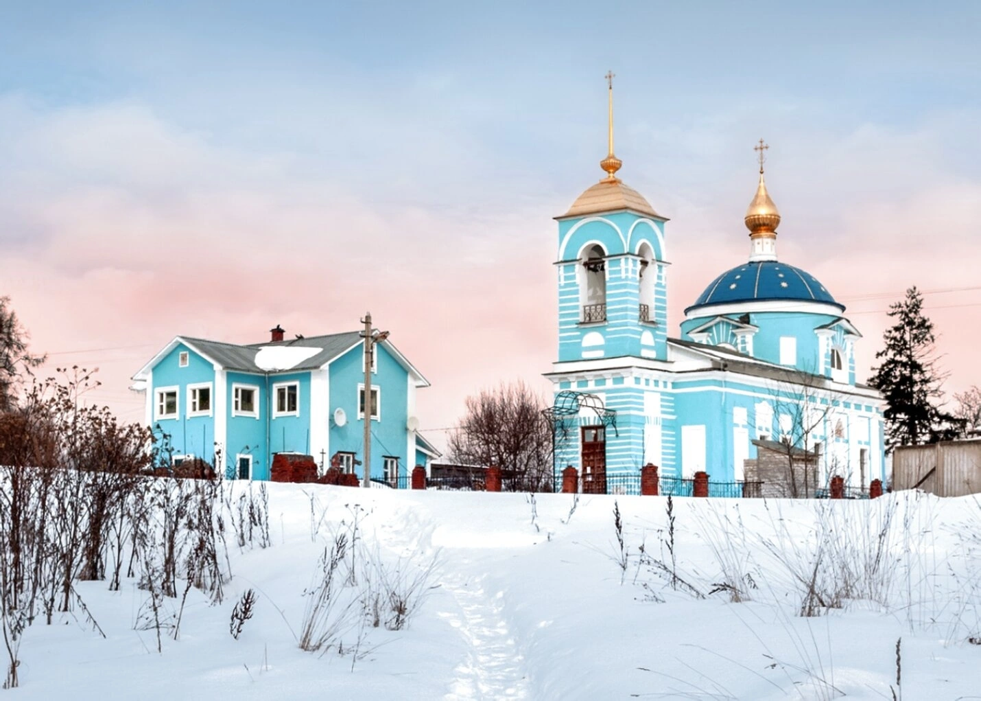 Небесная цветовая гамма храма гармонично перекликается с мягкими оттенками зимнего неба на закате, где розовые и голубые тона создают благостный фон для православной святыни. Тропинка, ведущая к храму, протоптана в снегу, символизируя путь верующих к Богу, молитве и духовному утешению. Церковь Владимирской иконы Божией Матери, возведённая в начале XIX столетия и полностью восстановленная в 1994 году после decades забвения, является не только памятником церковной архитектуры, но и действующим духовным центром, призывающим верующих под свои своды.