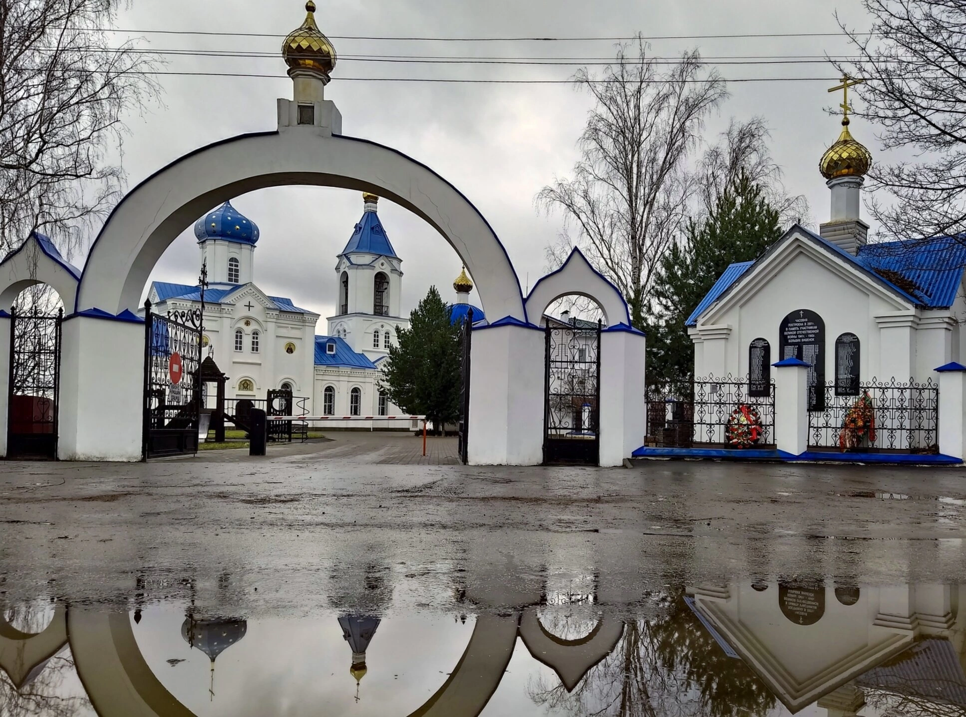 Особую художественную ценность и символичность кадру придаёт отражение всего комплекса в воде, скопившейся на переднем плане после недавнего дождя. Это зеркальное удвоение создаёт ощущение мира горнего и мира дольнего, напоминая верующим о стремлении к духовному преображению. Оголённые ветви деревьев и пасмурное небо указывают на позднюю осень или раннюю весну, добавляя снимку особое настроение тишины, умиротворения и светлой печали.