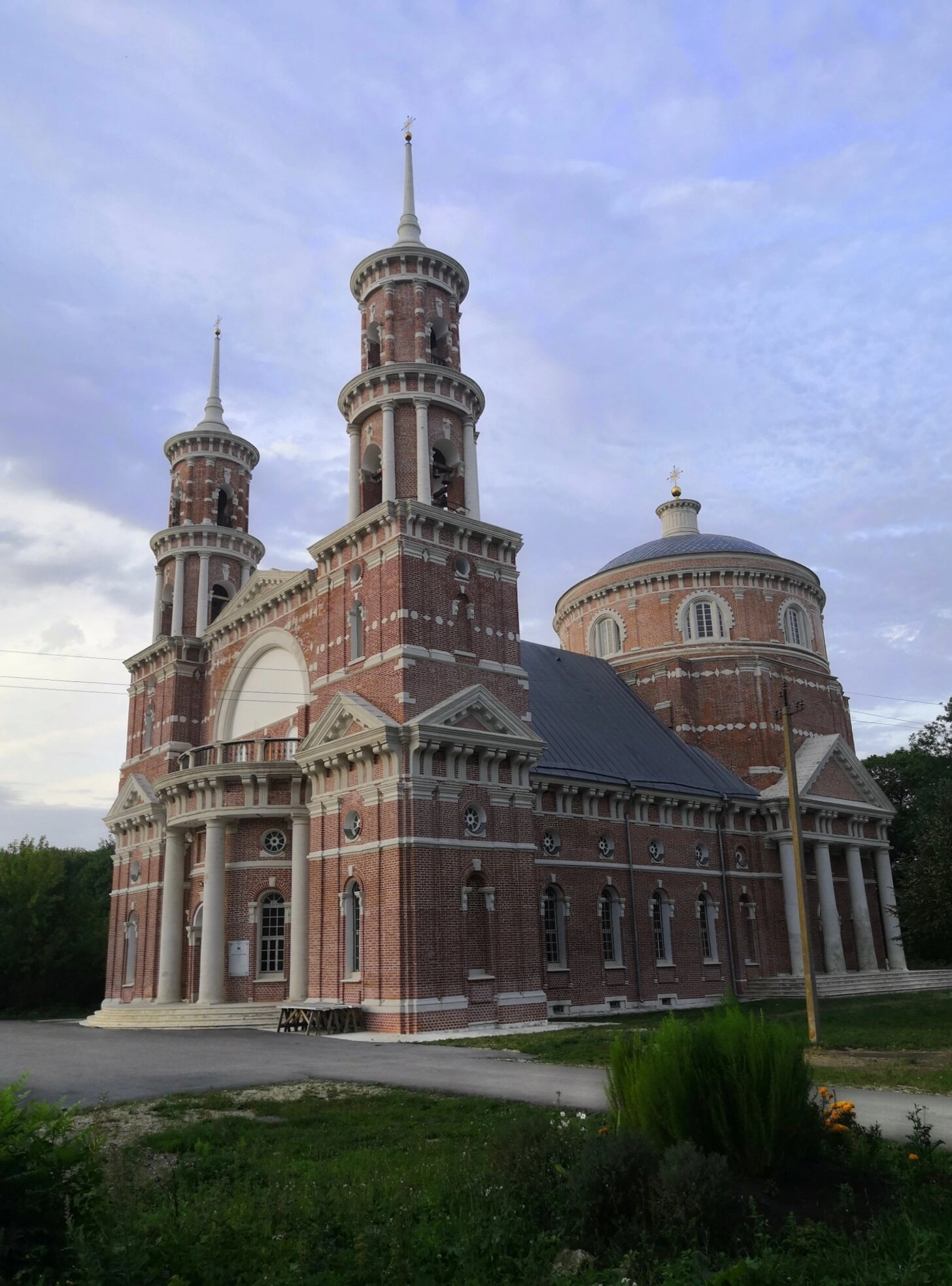 На представленной фотографии запечатлён величественный Владимирский храм, освящённый в честь чудотворной иконы Пресвятой Богородицы Владимирской. Этот православный храм располагается в историческом селе Баловнево Данковского района Липецкой области и является выдающимся памятником церковной архитектуры конца XVIII столетия.