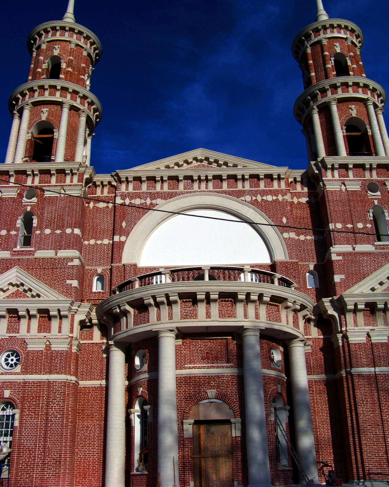 На фотографии изображён центральный вход в храм, акцентированный монументальным четырёхколонным портиком, увенчанным треугольным фронтоном. Мощные стены, сложенные из кирпича, и лаконичный декор фасадов подчёркивают монументальность и духовную твердыню православной веры. Несмотря на годы запустения в советский период, когда храм был закрыт и частично разорён, его внешний облик сохранил черты былого благолепия.